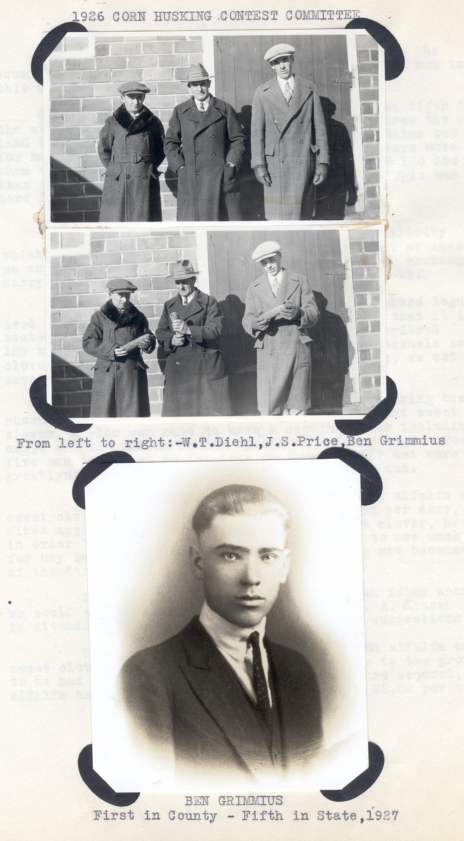 This object contains three photographs all relating to the 1926 and 1927 Corn Husking Contests. The men pictured in the first and second of the three photographs are members of the 1926 Corn Husking Committee. From left to right, W.T Diehl, J.S. Price, and Ben Grimmius. Ben Grimmius is also the man in the third photograph. In 1927, Ben Grimmius was first in the county contest and fifth in the state contest. For any use other than instructional resources, please check with the organization that owns this item regarding copyright restrictions. |