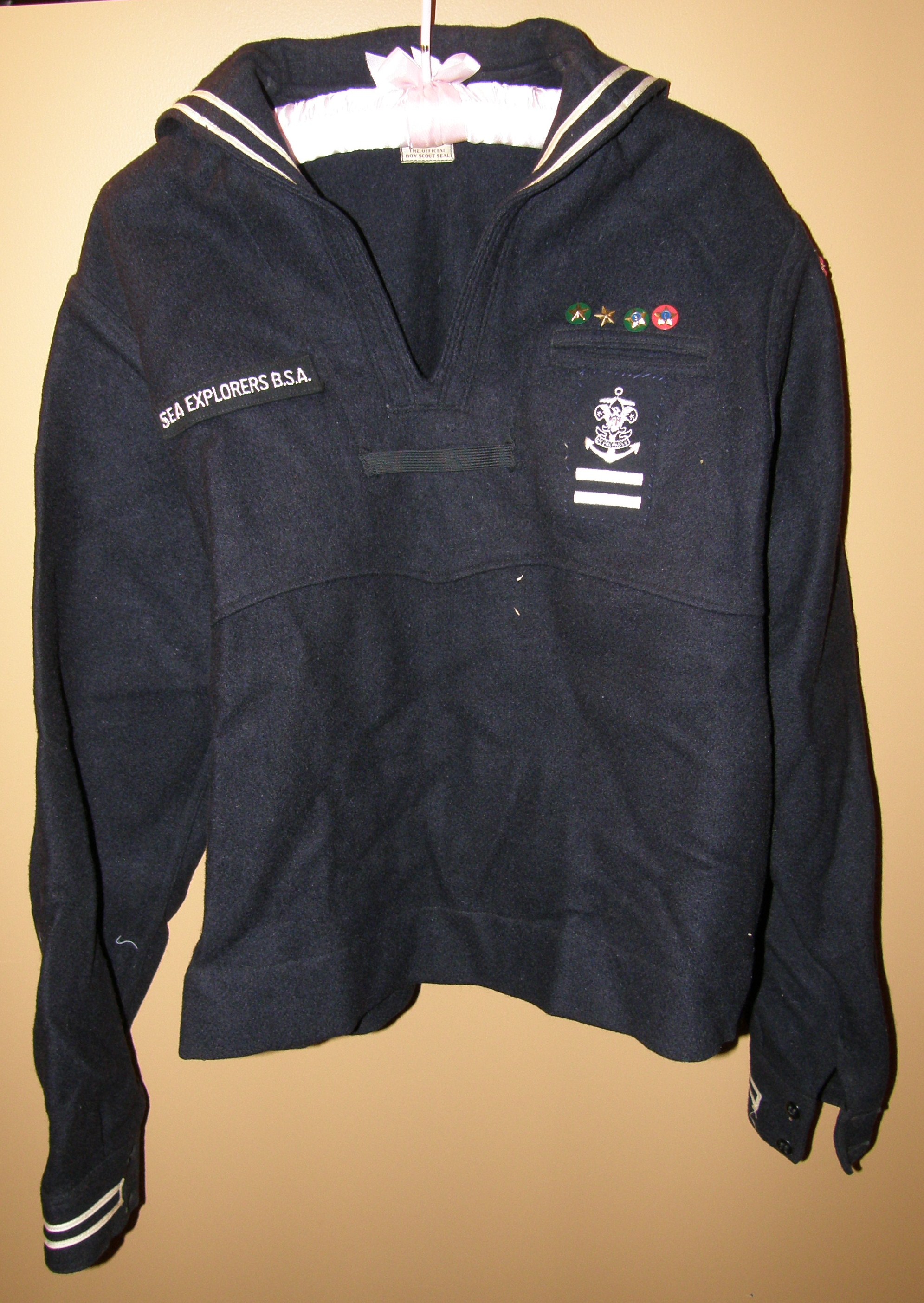Sea Explorer Scout uniform shirt made of black wool. Shirt is long sleeved with a sailor's collar edged in two rows of white twill and twill around sleeve cuffs. "Sea Explorers B. S. A." embroidered on front right chest; anchor over two bars embroidered in white on left front pocket, above which are four circular pins, "Cedar Falls Iowa 138" troop badges on left shoulder; on right shoulder is a patch "Cedar Falls District". Flat cloth bar to hold scarf in place in front (scarf is missing). Shirt is 23 inches long from shoulder to hem. Founded in 1912 by Arthur A. Carey, Sea Scouting in America sought to teach young boys the art of sailing from an early age. The distinctive sailor uniform, adopted in 1922 as a result of Commander Thomas J. Keane's influence, helped to distinguish the Sea Scouts from the larger Boy Scouts of America organization. This uniform was issued after September 1, 1949, when the Sea Scouts were renamed as the Sea Explorers. For any use other than instructional resources, please check with the organization that owns this item regarding copyright restrictions. |
