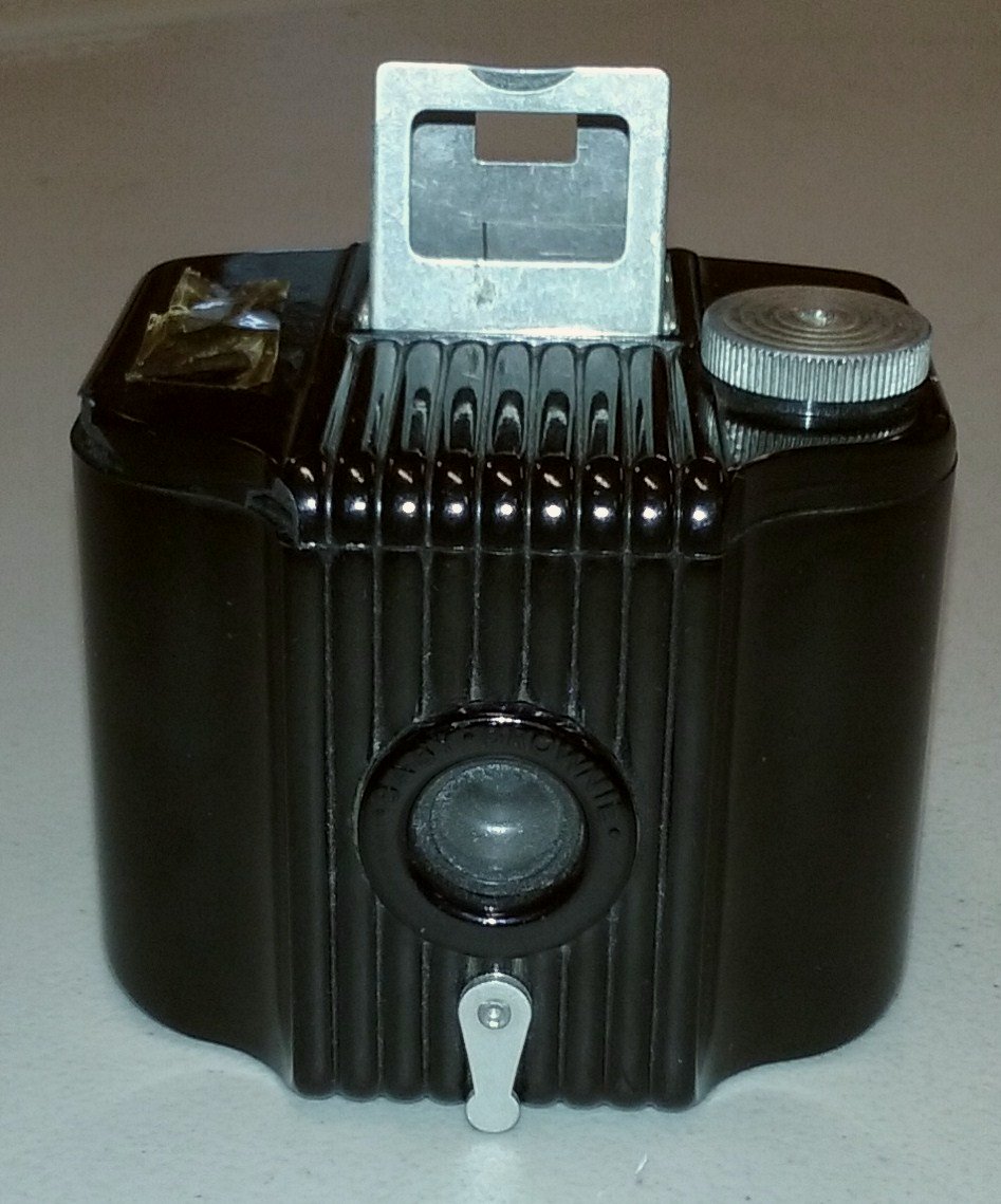 This simple box camera is a Baby Brownie. It has a bakelite body and uses size 127 film. The Baby Brownie was produced by the Eastman Kodak Co. from 1934 to 1941 in the US, and 1948 to 1952 in the UK. This one dates to circa 1936. For any use other than instructional resources, please check with the organization that owns this item regarding copyright restrictions. |