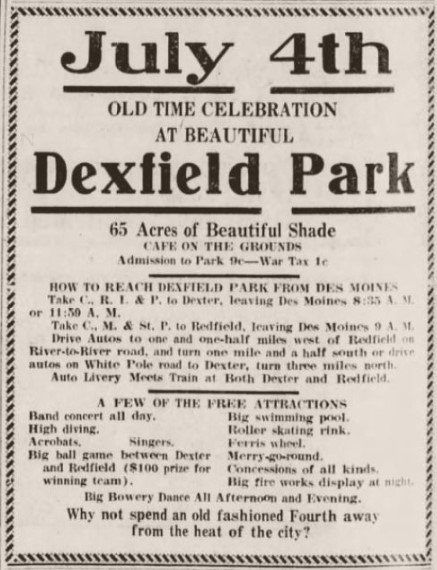 Dexfield Park was an amusement park in the early 1900s that became a popular attraction for Iowans. The park featured a movie screen, carnival rides such as a ferris wheel, merry-go-round and shooting gallery. A large dance hall provided space for music and dancing. The park also rented out canoes during the day, had a camping area and a small petting zoo. |
