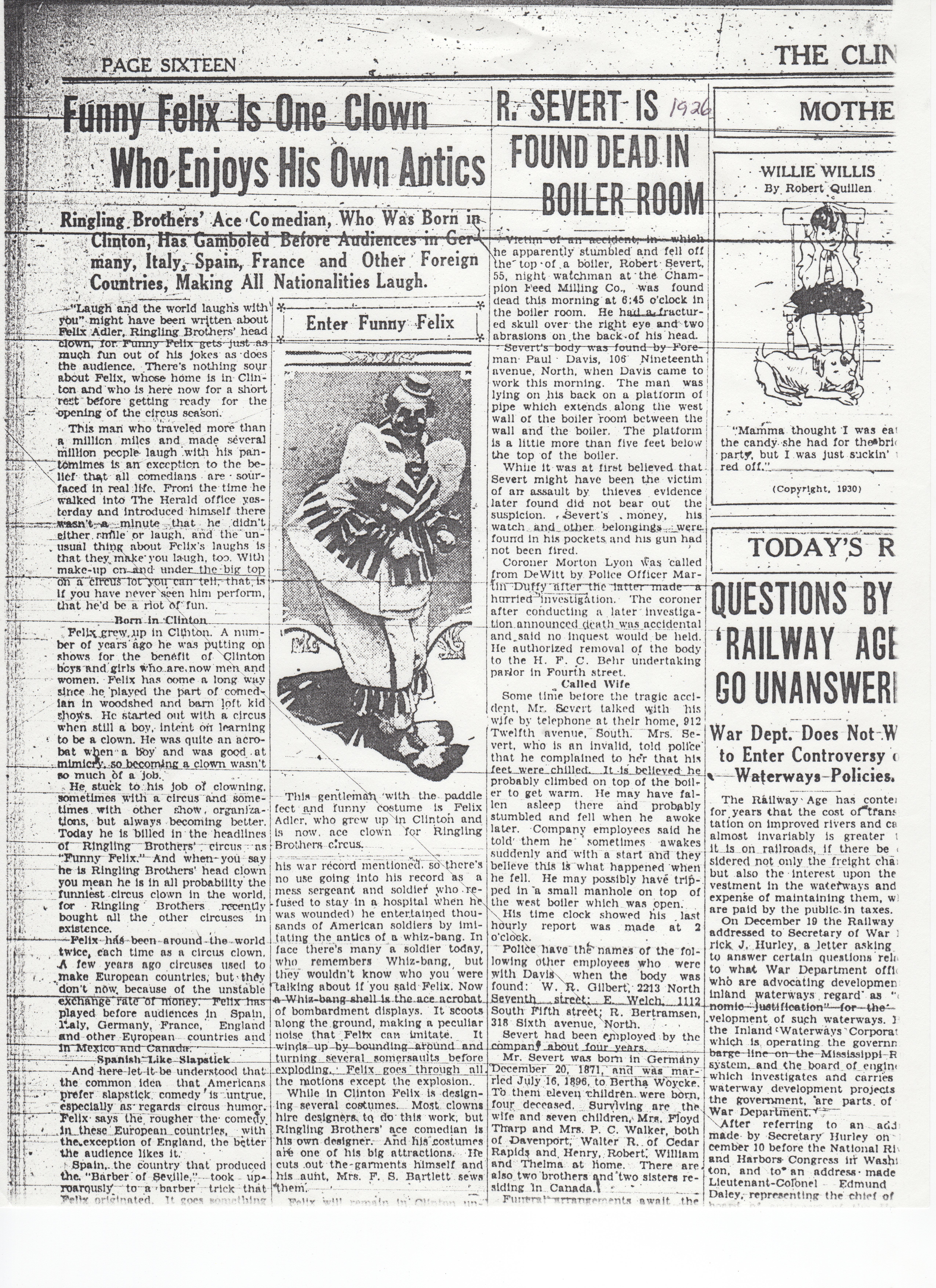 This clipping from the Clinton Herald newspaper discusses Frank "Felix" Adler and his work with the Ringling Bros. and Barnum & Bailey circus. According to the article, Adler traveled across the world and performed in countries such as Spain, France, Mexico, Canada, and many others. The article also briefly mentions Adler's service in the Army. Frank Adler, who later used the stage name Felix Adler, was born in Clinton, Iowa on June 17, 1895. At the age of 15, Adler began working as a comedian around the Clinton area. Sometime around 1914, Adler joined Ringling Bros. and Barnum & Bailey circus. Shortly after, however, Adler left the circus and served in the Army during World War I. In 1919, Adler returned to the circus and became "Funny Felix the Clown." During his career, Adler appeared in movies and TV shows including The Greatest Show on Earth (1952), The Jackie Gleason Show, Person to Person, Howdy Doody Show, Super Circus and Martin Kane Private Eye. He was the first American clown on television. Adler also earned the nickname, "The Whitehouse Clown" for the many times he performed for United States presidents, including Warren Harding, Calvin Coolidge, and Franklin D. Roosevelt. In 1948. Adler married Amelia Irwin, who also was a circus clown. The duo became the first husband and wife circus clown team. The pair retired from the circus in 1959. Frank "Felix" Adler passed away on February 1, 1960 and was buried in Clinton, Iowa. To celebrate his life, the town of Clinton celebrates Felix Adler Day each June. Content can be used with the following standards: 3rd grade SS 3.28 Cultural Contributions in a lesson on entertainment in the early 1900s. For any use other than instructional resources, please check with the organization that owns this item regarding copyright restrictions. |