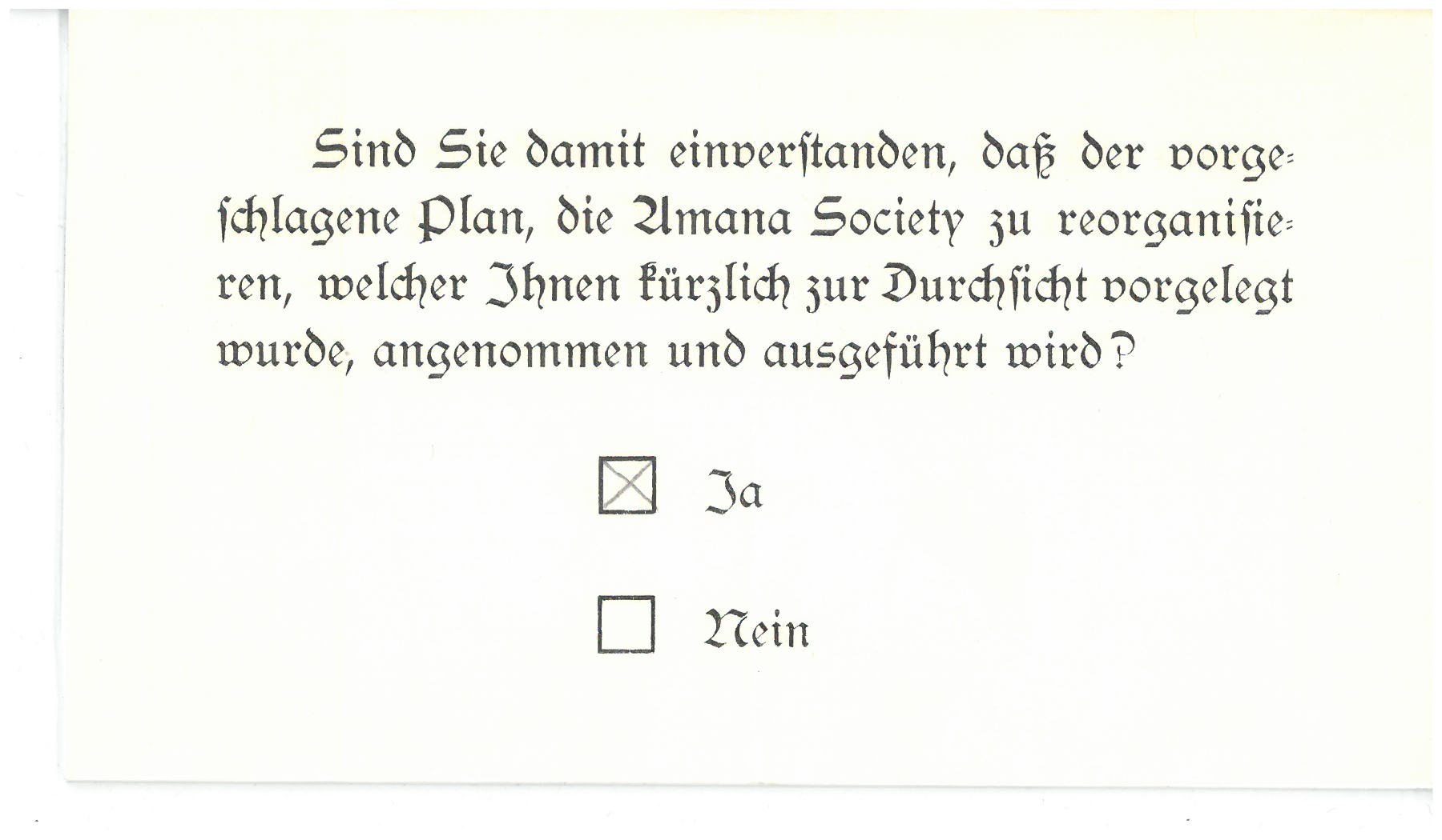 In 1932, the Amana Colonies in Iowa County held a vote over whether to keep or dissolve the community's communal structure. The members of the community voted in favor of dissolving the communal structure. This vote led the community to split into two organizations: the non-profit Amana Church Society and the for-profit Amana Society. The split became known as the "Great Change." The ballot reads: "Are you in agreement that the proposed plan to reorganize the Amana Society, which you've recently been provided for your review, should be accepted and executed? Yes or No" This ballot is marked "yes." Content can be used with the following standards: SS-Gov. 9-12.27 Unique Iowa Systems in a lesson on religious communities of Iowa and their society structure. For any use other than instructional resources, please check with the organization that owns this item regarding copyright restrictions. |