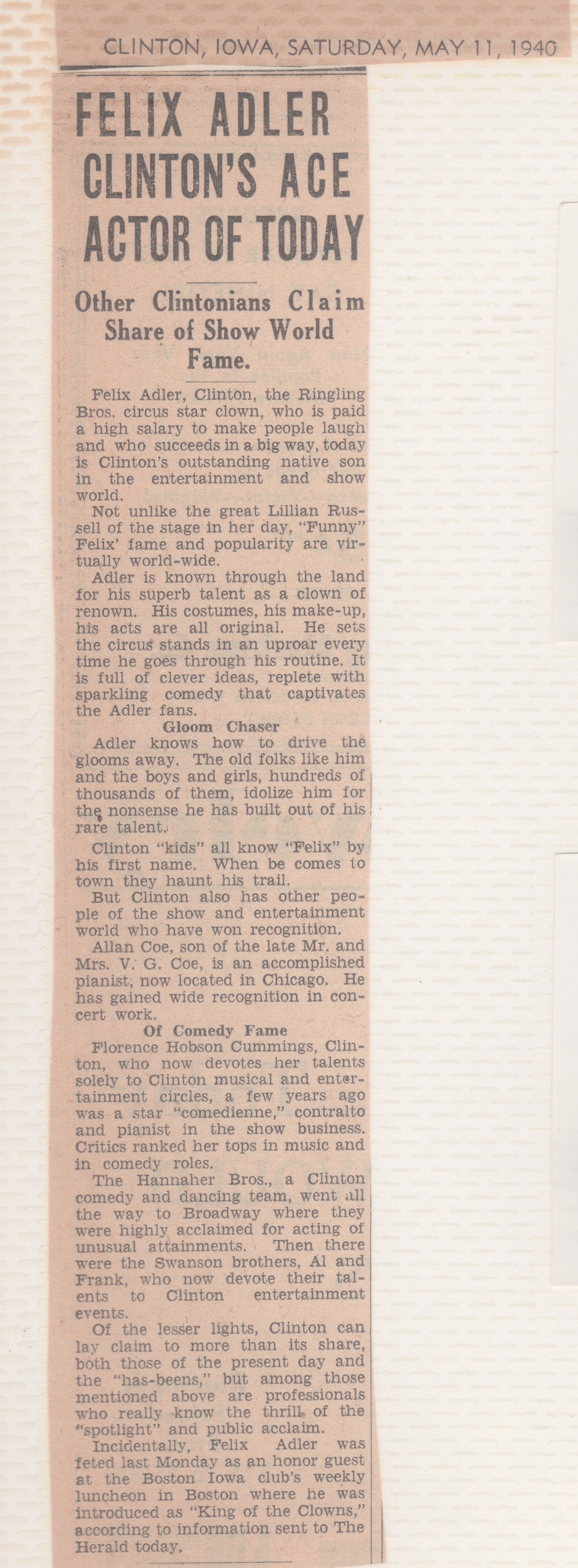 This newspaper clipping from Clinton, Iowa, discusses some of the town's famous natives. One of these natives was Frank "Felix" Adler, who worked as a clown with the Ringling Bros. and Barnum & Bailey circus. The article also discussed Allan Coe, a concert pianist, and comedians Florence Hobson Cummings, the Hannaher Brothers, and Al and Frank Swanson. Frank Adler, who later used the stage name Felix Adler, was born in Clinton, Iowa on June 17, 1895. At the age of 15, Adler began working as a comedian around the Clinton area. Sometime around 1914, Adler joined Ringling Bros. and Barnum & Bailey circus. Shortly after, however, Adler left the circus and served in the Army during World War I. In 1919, Adler returned to the circus and became "Funny Felix the Clown." During his career, Adler appeared in movies and TV shows including The Greatest Show on Earth (1952), The Jackie Gleason Show, Person to Person, Howdy Doody Show, Super Circus and Martin Kane Private Eye. He was the first American clown on television. Adler also earned the nickname, "The Whitehouse Clown" for the many times he performed for United States presidents, including Warren Harding, Calvin Coolidge, and Franklin D. Roosevelt. In 1948. Adler married Amelia Irwin, who also was a circus clown. The duo became the first husband and wife circus clown team. The pair retired from the circus in 1959. Frank "Felix" Adler passed away on February 1, 1960 and was buried in Clinton, Iowa. To celebrate his life, the town of Clinton celebrates Felix Adler Day each June. Content can be used with the following standards: 3rd grade SS 3.28 Cultural Contributions in a lesson on entertainment in the early 1900s. For any use other than instructional resources, please check with the organization that owns this item regarding copyright restrictions. |