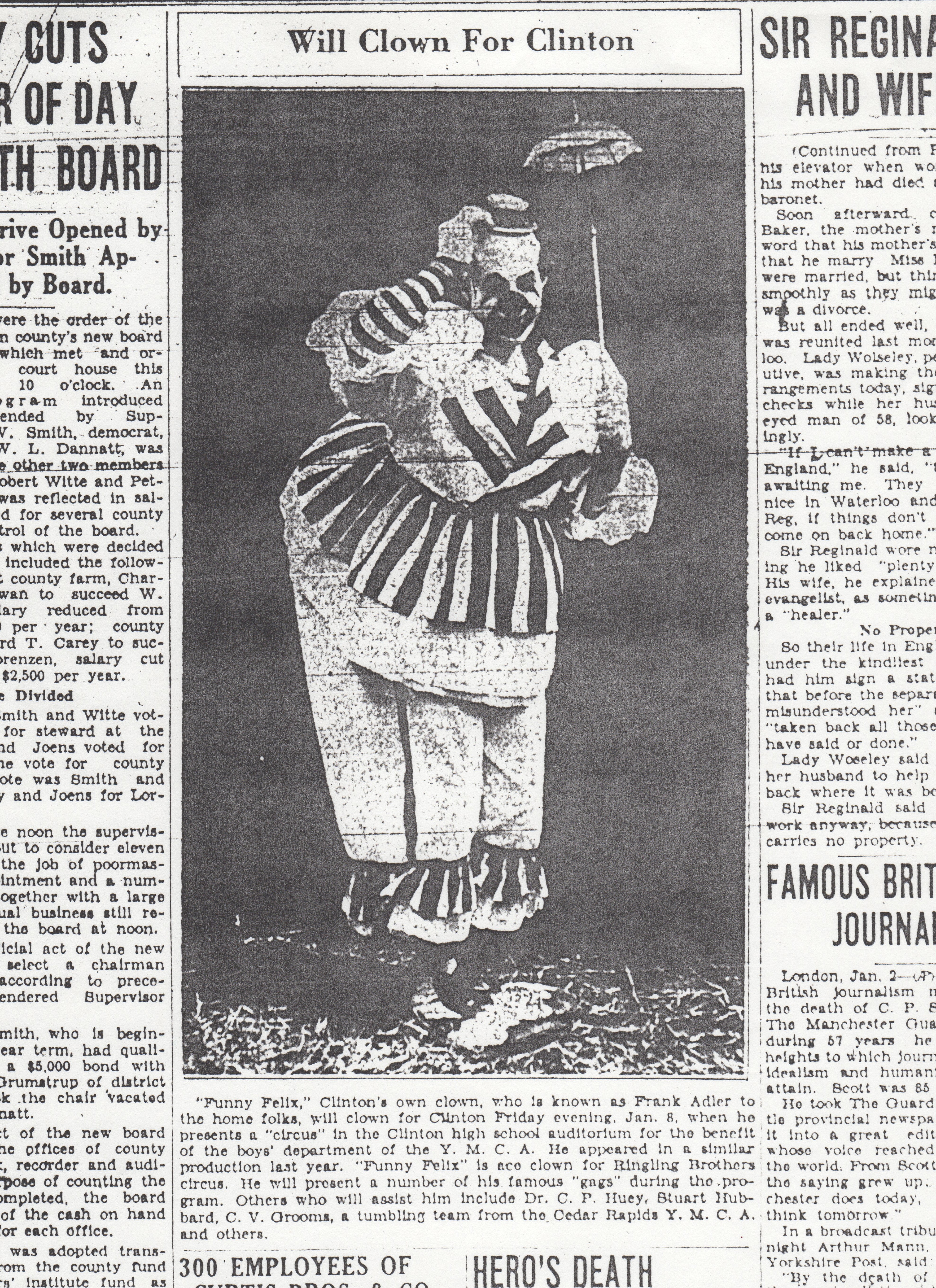 This short clipping advertises the "Felix Adler Circus" that Frank "Felix" Adler held in Clinton, Iowa, on January 8, 1932. Adler, a circus clown who performed with the Ringling Bros. and Barnum & Bailey circus for many years, often returned to Clinton around Christmas to present the Felix Adler Circus. Each year, he donated the proceeds for this performance to the Lend-a-Hand charity and the YMCA. Frank Adler, who later used the stage name Felix Adler, was born in Clinton, Iowa on June 17, 1895. At the age of 15, Adler began working as a comedian around the Clinton area. Sometime around 1914, Adler joined Ringling Bros. and Barnum & Bailey circus. Shortly after, however, Adler left the circus and served in the Army during World War I. In 1919, Adler returned to the circus and became "Funny Felix the Clown." During his career, Adler appeared in movies and TV shows including The Greatest Show on Earth (1952), The Jackie Gleason Show, Person to Person, Howdy Doody Show, Super Circus and Martin Kane Private Eye. He was the first American clown on television. Adler also earned the nickname, "The Whitehouse Clown" for the many times he performed for United States presidents, including Warren Harding, Calvin Coolidge, and Franklin D. Roosevelt. In 1948. Adler married Amelia Irwin, who also was a circus clown. The duo became the first husband and wife circus clown team. The pair retired from the circus in 1959. Frank "Felix" Adler passed away on February 1, 1960 and was buried in Clinton, Iowa. To celebrate his life, the town of Clinton celebrates Felix Adler Day each June. Content can be used with the following standards: 3rd grade SS 3.28 Cultural Contributions in a lesson on entertainment in the early 1900s. For any use other than instructional resources, please check with the organization that owns this item regarding copyright restrictions. |