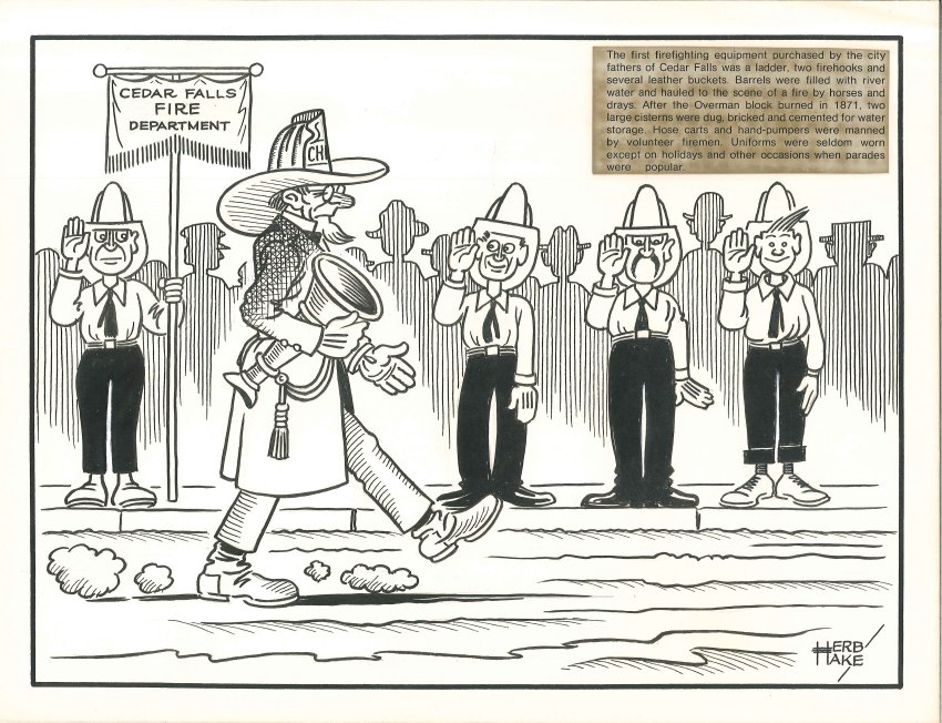 This drawing is an original ink and pen drawing that depicts four Cedar Falls Firemen saluting the fire chief. The cartoon drawing was commissioned from Herb Hake, a popular cartoon artist of Cedar Falls, for the Bicentennial Outlines of Cedar Falls book. Herbert Hake was born in Holyeton, Illinois in 1903. After graduating from Central Wesleyan College, he went to the University of Iowa to obtain a master’s degree. He then began to teach art and theatre, as well as being a commercial layout artist. In 1938, Herb Hake began to work at the Iowa State Teachers College (now called the University of Northern Iowa). He was a theatre scene designers and technical director. He then became the first radio program director, as well as radio and television director, at UNI. He is known for his "Landmarks in Iowa History". Not only was he a broadcaster, but he was also a cartoonist and local historian. Herb Hake passed away in 1980. He left behind a legacy at UNI, and was inducted into the Iowa Broadcasters Hall of Fame in 1978. (library.uni.edu) For any use other than instructional resources, please check with the organization that owns this item regarding copyright restrictions. |