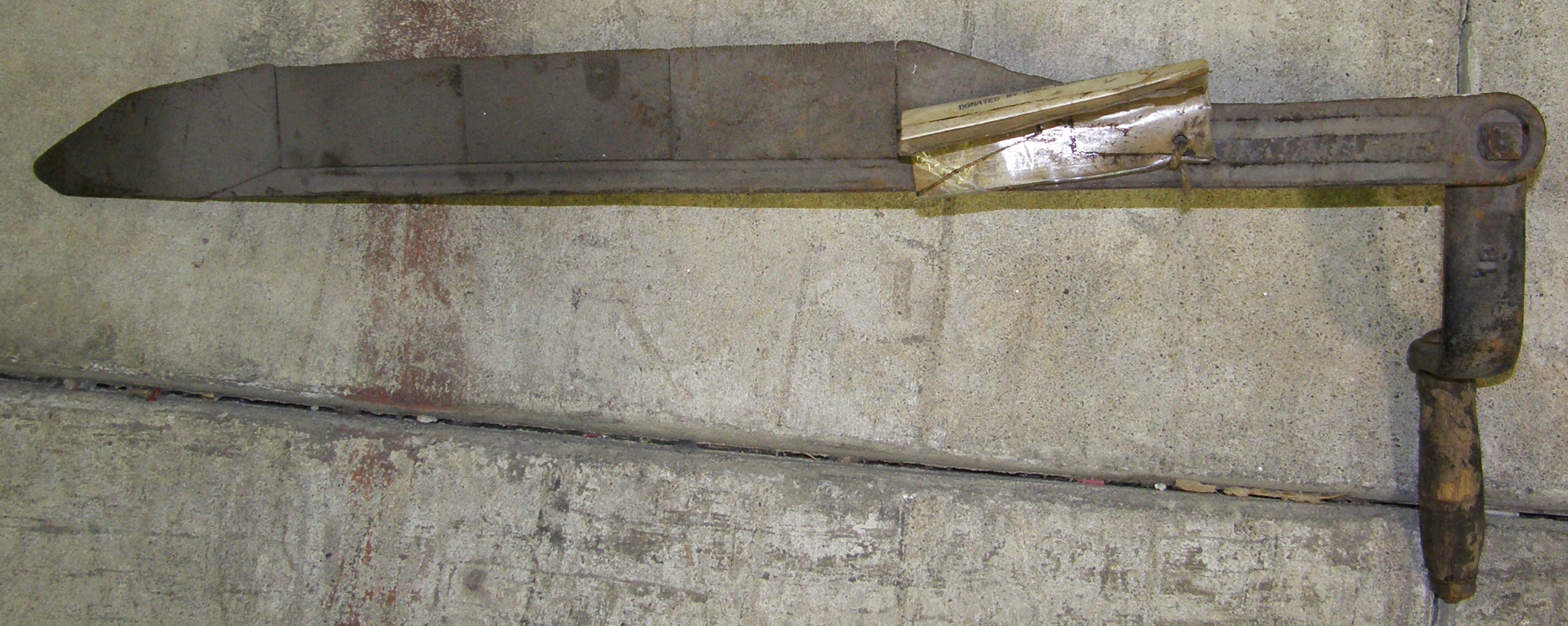 This hay knife was patented September 5, 1899 and is stamped "THE AMERICAN." Its steel shaft was originally painted green, which is now mostly worn off. This knife has a four-piece blade with small serrated edges and an adjustable handle with one horizontal and one vertical grip. This knife was found in 1949 on the farm at 610 East Dunkerton Road, Black Hawk County, Iowa. For any use other than instructional resources, please check with the organization that owns this item regarding copyright restrictions. |