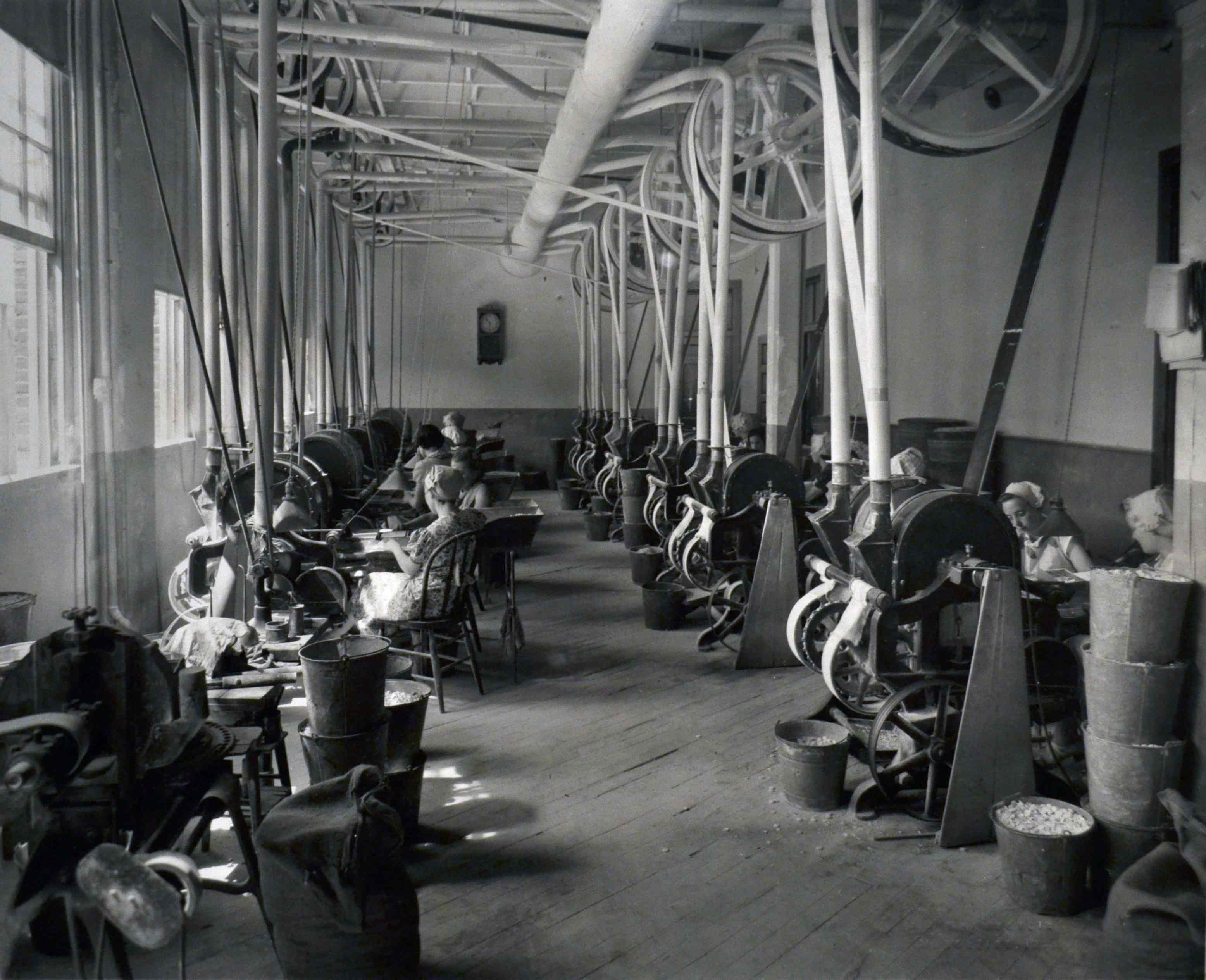 This photograph, taken around 1920, shows several women working inside one of Muscatine's many pearl button factories. John Frederick Boepple, a German immigrant button maker, launched the pearl button industry in Muscatine in 1891, when he opened a small button shop. The button and clamming industries started small but quickly overwhelmed the town. Clamming became the Mississippi River's gold rush while large automated factories and shell-cutting shops employed nearly half the local workforce. By 1905, Muscatine made 37 percent of the world's buttons and earned the title of "Pearl Button Capital of the World." Entire families - men, women, and children - contributed to the industry, giving weight to the popular local saying "No Muscatine resident can enter Heaven without evidence of previous servitude in the button industry." Although the industry peaked in 1916, several decades passed before the American-made pearl button buckled under the pressure of foreign competition, changing fashions, limited availability of shell, and the development and refinement of plastic buttons. Content can be used with the following standards: 2nd grade SS 2.24 Natural Resources, SS-W.H. 9-12.26 Iowans Influence World History and 4th grade SS 4.25 Technological Changes in a lesson on the how the natural resources of Iowa led to businesses and new industries. For any use other than instructional resources, please check with the organization that owns this item regarding copyright restrictions. |