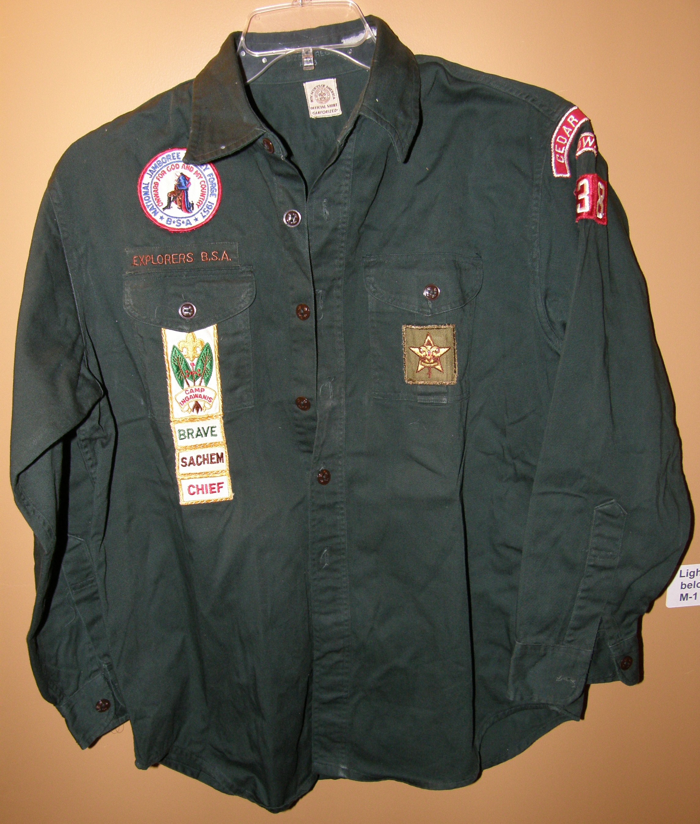 Dark green cotton Explorer Scout long sleeve shirt, with collar and button front. Left shoulder patch "Cedar Falls Iowa 138". Right shoulder patch "Cedar Falls District". Two front button down pockets. Above the right pocket is a round patch " National Jamboree Valley Forge 1957 B. S. A. Onward For God and My Country". Embroidered above pocket in light brown is "Explorers B. S. A." Patches sewn on right pocket are "Camp Ingawanis", "Brave", "Sachem", and "Chief". There is a patch on the left pocket, a green square with a gold star edged in brown in the center with the Boy Scout trefoil inside the star. The Explorer Scout program began as a senior scouts program for young men over the age of fourteen. By 1935, the members of this separate program were officially referred to as Explorers, a designation which would expand to cover all scouts over the age of 14 by 1949. By the 1970's however, Exploring shifted its focus to educating and preparing members for potential carriers in the professional and trade fields. At this time, women of the same age were able to join as full members of the Explorers. This particular example displays two different forms of rankings. After 1959, scouts could be designated by bronze, silver, and gold awards. The use of "Brave", Sachem", and "Chief" are part of an older system which appropriated Native American terms. For any use other than instructional resources, please check with the organization that owns this item regarding copyright restrictions. |