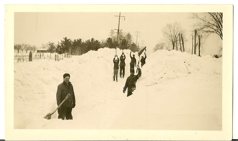 Groups of citizens like the ones pictured in this photograph, took upon themselves to form groups to shovel snow off country roads in order to get to town. For any use other than instructional resources, please check with the organization that owns this item regarding copyright restrictions. |