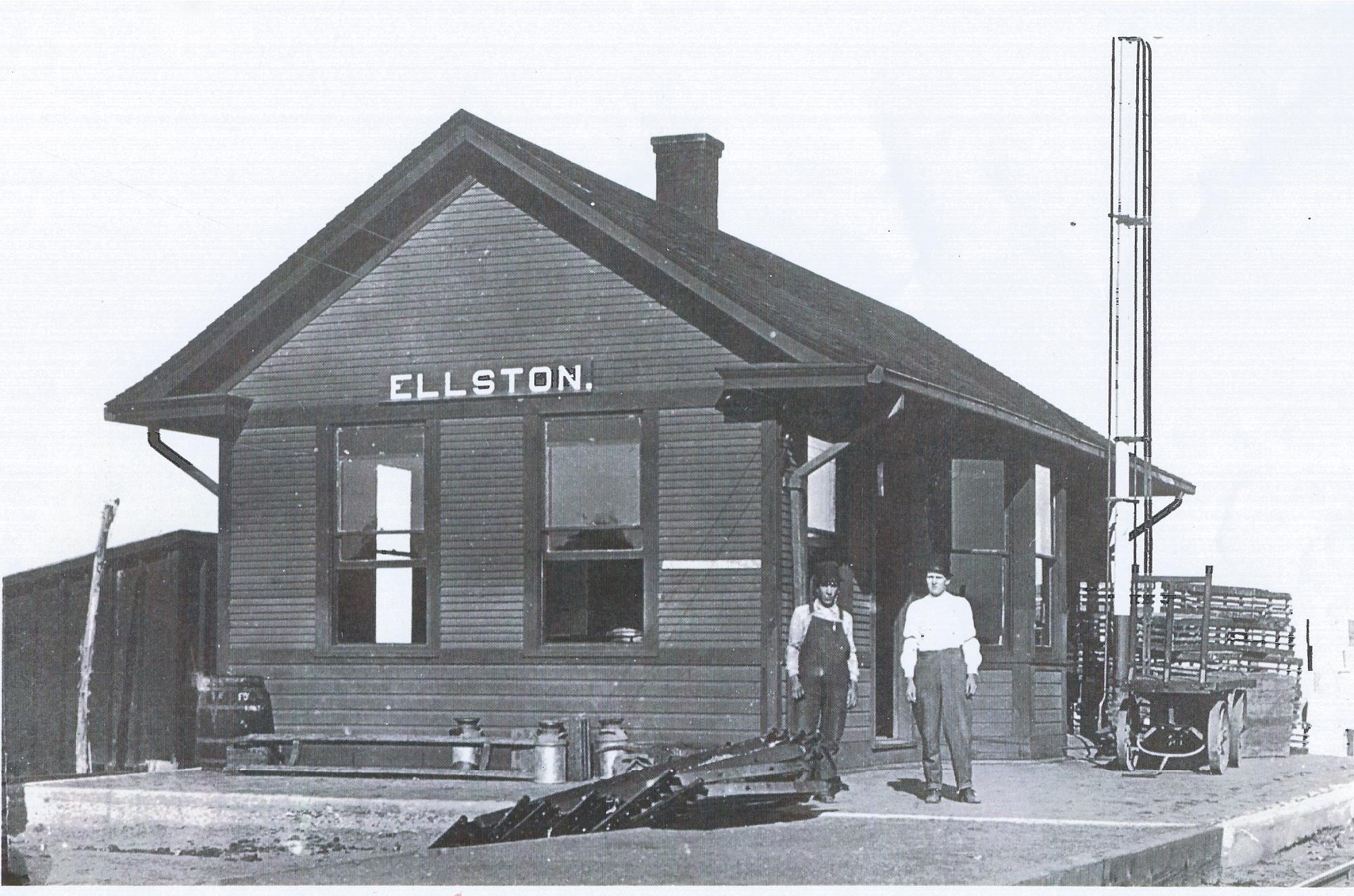 The Keokuk & Western Railroad built this depot in Ellston, Iowa, after building a rail line through the area in 1882. Ellston was originally named Wyrt, Iowa, however, the town of Van Wert, Iowa, was located along the same rail line, so the railroad insisted that the town change its name. The Chicago, Burlington, & Quincy Railroad purchased the Keokuk & Western Railroad in 1895 and took over the Ellston depot. The Railroad closed the rail line that ran through Ellston in 1945. Content can be used with the following standards: SS-Econ. 9-12.24 Iowa Impact Upon Economy in a lesson on Iowa businesses and town establishment in the early 1900s. For any use other than instructional resources, please check with the organization that owns this item regarding copyright restrictions. |