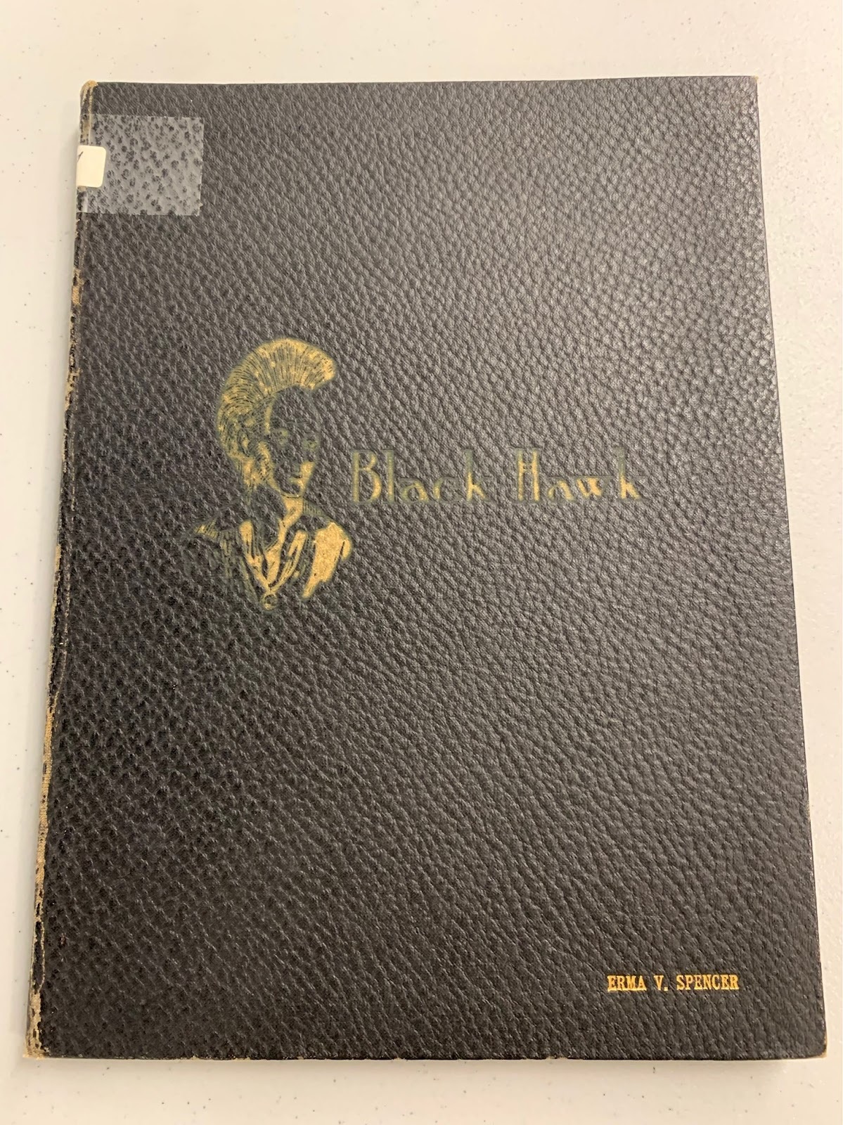 This is a leather-bound "Blackhawk" yearbook from Davenport High dated 1918. The casing is black tanned leather with a gold-colored engraving on the front. The engraving depicts Chief Blackhawk, a Native American leader of prominence. This book contains the poems detailed in items 2021.003.004 and 2021.003.005. This content can be used with the following resources: SS 4.25: Technological Change This item can be used as a comparison piece when teaching students about the evolution of public schooling in Iowa or the evolution of printing technology as a whole. The style of leather book binding as seen in this item has gradually become rarer, which can be used to educate students on how literature and the technology which produces literature changes over time. For any use other than instructional resources, please check with the organization that owns this item for any copyright restrictions. |