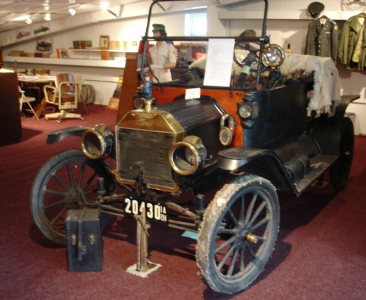 1914 Ford Model T. When it first came out it costed $500 new. 35,017 of these cars were made. This model has a four cylinder L head. The cylinder head is called an internal combustion engine which sits on top of the cylinder block on the motor block. The L head means there is a sidevalve. Valves are sealed with a head gasket. This particular automobile is all original, just as it came off the factory line. The car has only 1,000 miles on it. It can produce up to 20 horsepower. On the back, the Model T sports the classic turtle neck trunk. The tank located on the running board holds acetylene for the head lamps on the car. The sidelights and tail lights use kerosene. This Model T was the first car purchased by the Hemken Collection in 1957. For any use other than instructional resources, please check with the organization that owns this item regarding copyright restrictions. |