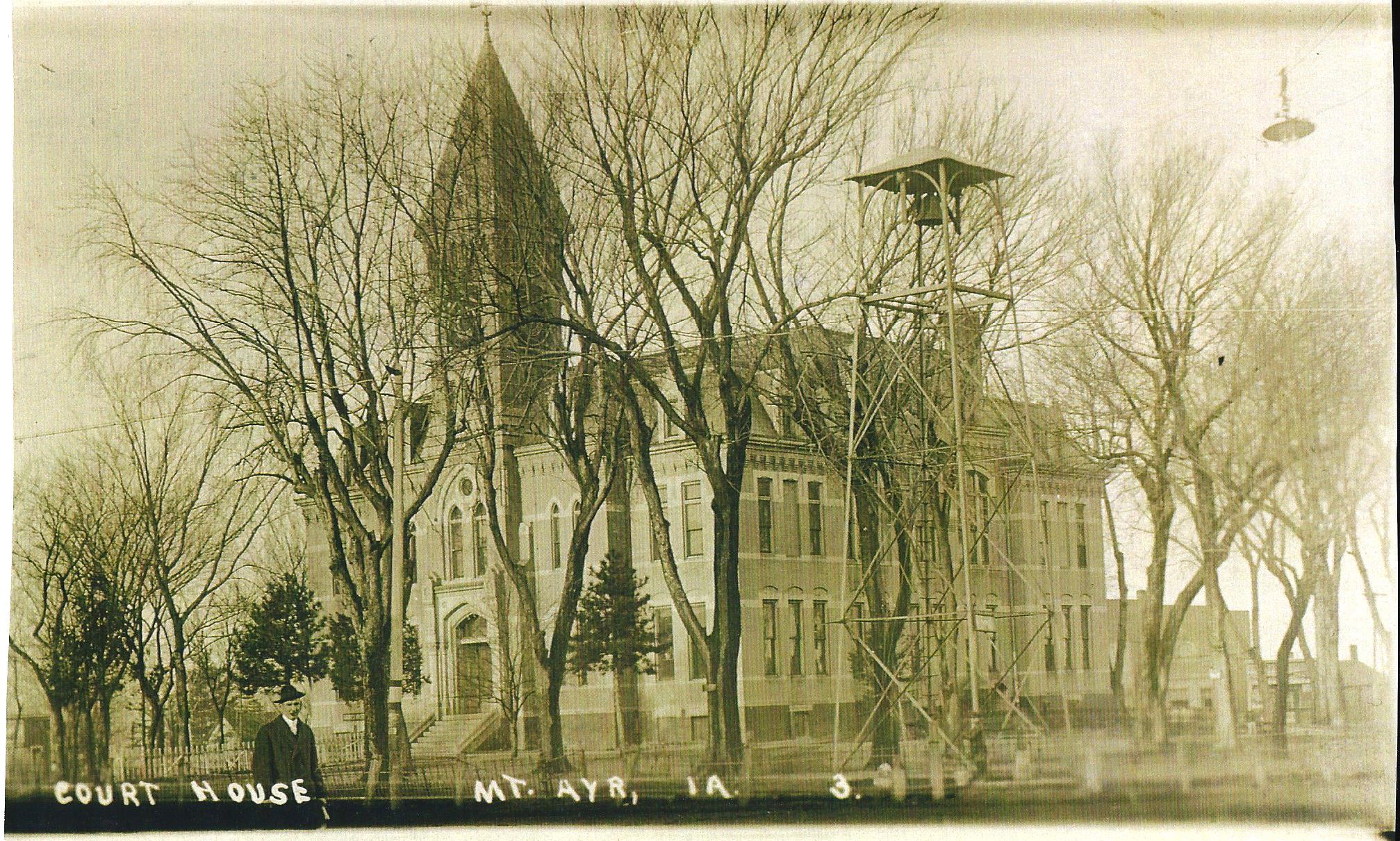 The first two courthouses of Mount Ayr were originally built of wood, but after natural disasters destroyed both buildings, a new brick and stone model was built in 1890 for $36,455. In 1921, the building was torn down and voters agreed to build a new courthouse in 1926. The three-story brick building cost $132,533 and follows a minimal Beaux-art and Neoclassical architectural style. |