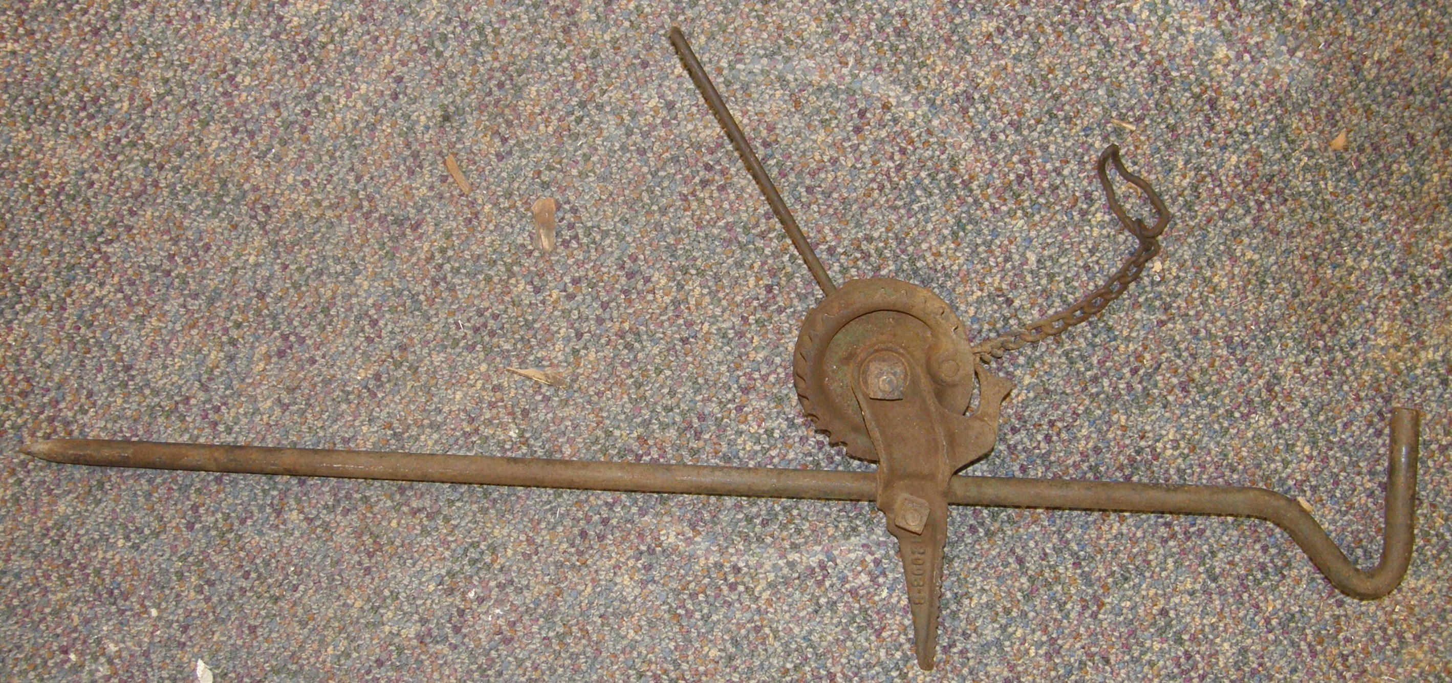 This is a check-wire anchor stake, also known as a corn stake or row marker. This stake anchored the knotted wire that ran through the trip forks on a two-row corn planter. As each knot ran through the trip forks two hills of corn were planted in parallel rows. At the end of each row, the farmer moved the anchor stake to the center of the planter, adjusted the tension on the wire to that of the previous row, and continued to plant. In this way the field was planted in an even grid that allowed for cultivation of weeds either lengthwise or crosswise of the field. Today, corn is drilled closer together which does not allow for cross-cultivation, and herbicides are used to keep the weeds out. For any use other than instructional resources, please check with the organization that owns this item regarding copyright restrictions. |