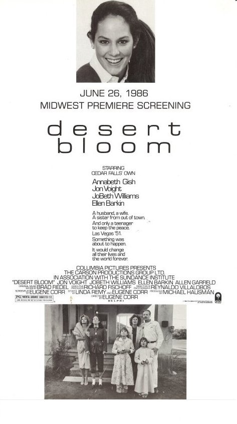 The poster listed above is for the 1986 film, Desert Bloom. It stars Cedar Falls native, Annabeth Gish. This movie includes other well known movie stars Jon Voight, JoeBeth Williams, and Ellen Barkin. This poster was to help advertise the special Midwest screening in Cedar Falls on June 26, 1986. Gish played the role of Rose Chismore, the main character of the story. For any use other than instructional resources, please check with the organization that owns this item regarding copyright restrictions. |