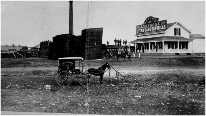 This photograph shows one of the sawmills owned by William J. Young of Clinton, Iowa. The sign on the building says "Steam Gang Sawmill". Young was born in Ireland in 1827 and emigrated to the United States in 1846. As a young man, he worked as a railroad contractor, and it was while he was working for the railroads that he met some wealthy men in Cincinnati who owned the Ohio Mill Company. They wanted to open a lumber yard in Clinton, Iowa and hired Young as an agent to run it. Young believed he would have more opportunities in the lumber business than he would working for the railroad, so he agreed to move west to Iowa. Eventually Young became a partner in the business, and it was renamed the W. J. Young Lumber Company. Young's lumber company provided settlers in Iowa and nearby states with lumber to build homes, barns and businesses. The expansion of the railroad after the Civil War also contributed to the success of the company in a couple of different ways. Railroad companies required a large amount of lumber, especially to build bridges, and the railroads provided a way to transport lumber to other markets. To meet growing demands, Young doubled his capacity in 1867 with the construction of a second sawmill. This second sawmill was said to have the largest production capacity of any mill along the Mississippi River. Content can be used with the following standards: SS-Econ. 9-12.24 Iowa Impact Upon Economy in a lesson on Iowan businesses during Reconstruction and its impact on the state. For any use other than instructional resources, please check with the organization that owns this item regarding copyright restrictions. |