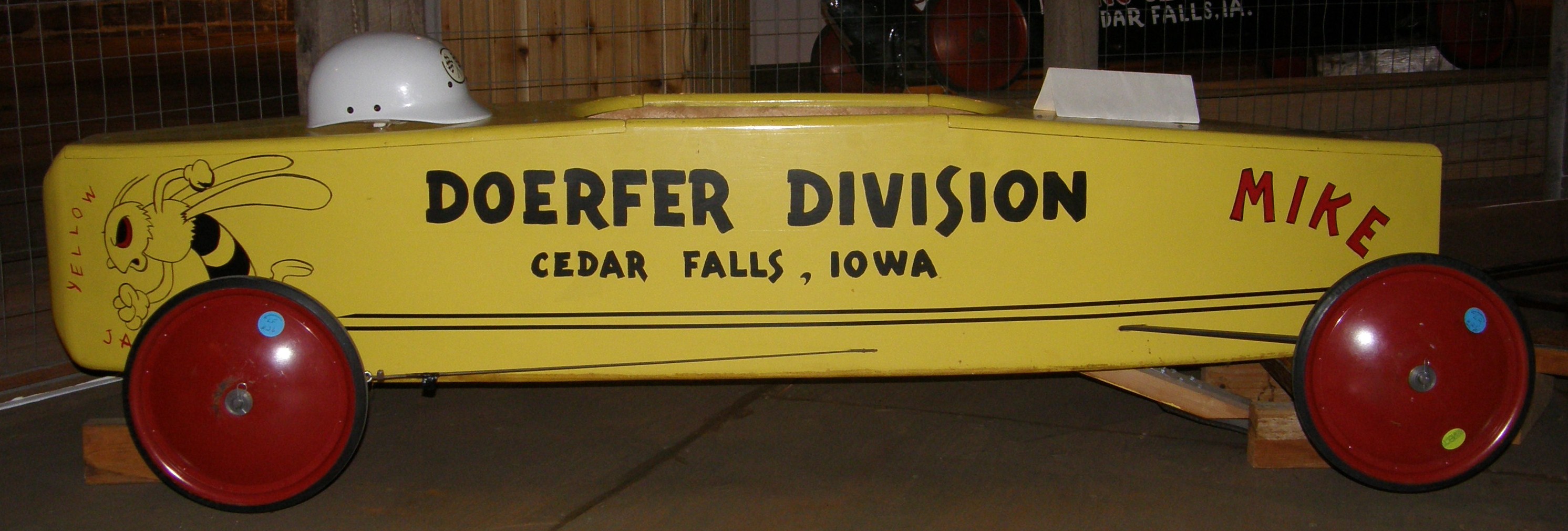 Soapbox Derby car sponsored by Doerfer Division, built and driven by Mike Jerke in 1978 and 1979. Mike Jerke and his father (Marlyn) built this in 1978 in Cedar Falls. Mike raced in Cedar Rapids, Des Moines and Warren, Ohio (pre Akron, Ohio race). Mike was 11-12 when he built the car. For any use other than instructional resources, please check with the organization that owns this item regarding copyright restrictions. |