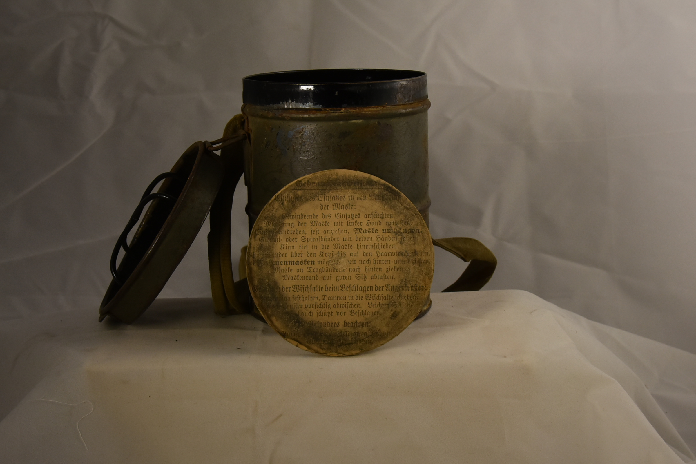 This is the filter container for a Lederschutzmaske-type gas mask from the First World War. It is a round, cylindrical canister with a hinged lid and cloth carrying strap. The top surface of the lid reads, "Mathes 12/111," indicating the battalion and regiment that this item's owner belonged to. On the inside of the lid is a faded maker's label, which is now illegible. On the bottom of the canister is a printed disk of paper detailing (in German) the instructions for how to properly use and clean the filters provided. The edges of this paper disk are discolored, making exact translation difficult. In comparison to American gas masks of the same time period, German Lederschutzmaske used can-shaped filters that attached directly to the face of the mask itself, rather than to a tube. This canister would have carried such filters. There is considerable rust and other patina on the exterior and interior surfaces of this object, as is to be expected due to its age and probable use. This content can be used with the following resources: SS.4.25: Technological Change This content can be used to educate students on the evolution of chemical warfare technology and how that evolution impacted the lives of Iowan servicemen during the First World War. For any use other than instructional resources, please check with the organization that owns this item for any copyright restrictions. |