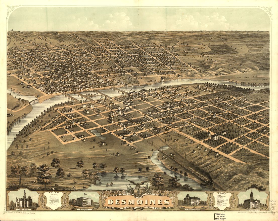 Cities Communities Early Explorers Environment People Road Systems Rural Life Towns Bird's-eye view prints Des Moines Iowa |