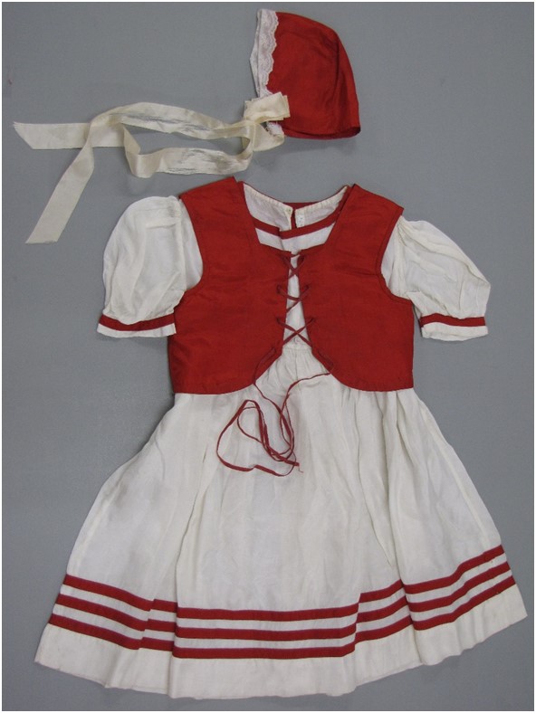 On April 20,1939, Crown Prince Frederick of Denmark and his wife, Crown Princess Ingrid, traveled from Omaha, Nebraska, to Des Moines, Iowa. The couple made a stop in Atlantic, Iowa, and addressed a crowd of 5,000 people. The Atlantic high school band played the Danish national anthem and the Crown Prince addressed the crowd in both Danish and English. This folk dress was worn by Alice Hansen, one of two girls from Elk Horn, Iowa, who were selected to meet the Danish royals. The two girls presented a bouquet of flowers to the royals, and they believed they were selected because they could speak Danish. The dress was handmade by Alice Hansen's mother. Content can be used with the following standards: 3rd grade SS 3.27 Immigration and Migration and SS-WH 9-12.26 Iowans Influence World History in a lesson on Danish immigrants in Iowa and their relations between the United States and Denmark. For any use other than instructional resources, please check with the organization that owns this item regarding copyright restrictions. |