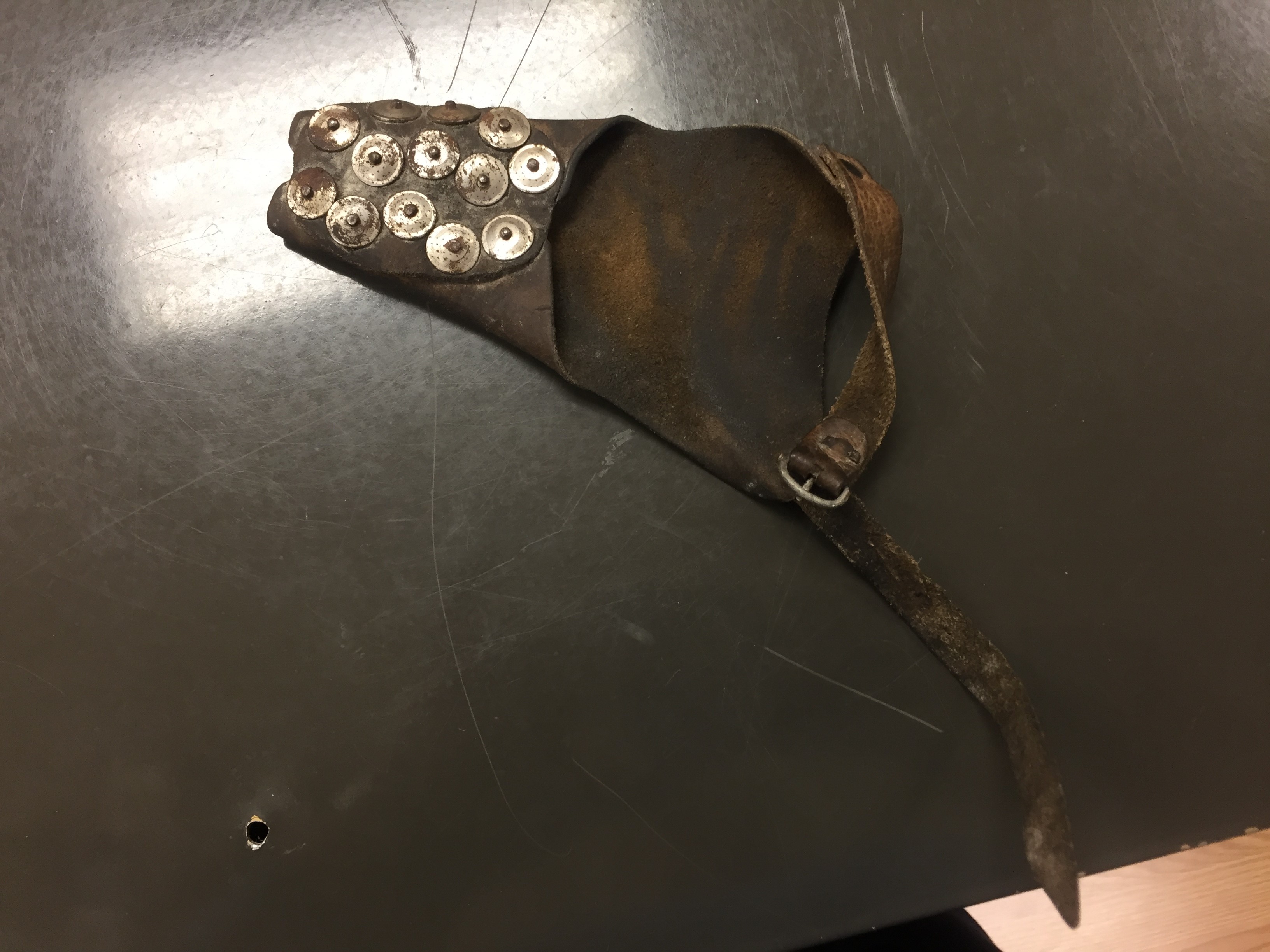 Creating the husking hook in 1892, William F. Lillie designed a husking glove that would allow a farmer to quickly husk his crops, making the process more efficient. The glove would be attached onto the hand with leather straps and had an bent metal piece on the palm that would be used to rip open the husk and remove the corn. The glove also had a thick leather pad to protect the farmer's hand. An additional leather pad, as pictured, could be worn for more protection. |