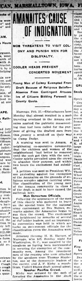 The members of Amana believed strongly in pacifist views, where they stayed out of European affairs before immigrating to the United States and continued after settling in New York and Iowa. Amana was excused from fighting during the Spanish American and Civil War by paying commutation fees to support Iowan soldiers in their place. The pacifist belief was met with disagreement by Iowa County residents as Amana men were sent home from Marengo in July of 1917 after being orginally chosen for the draft in WWI. In January of 1918, the classification status of Amana residents was changed from 1 to 4, mean that they were deferred from fighting. Their place would be taken by other Iowa County men. Believing this was an act of disloyalty, angry Marengo residents marched to South Amana in protest, however the mob was stopped one mile outside of South Amana. After WWI, the exemption of Amana residents from being drafted was rescinded. Despite their pacifist beliefs, the colonies supported the troops by donating to the Red Cross, using Liberty Bonds and War Savings Stamps. The Amana Woolen Mill also produced 35,000 blankets for troops. In total, Amana gave approximately $2,000 per resident to the war effort. |