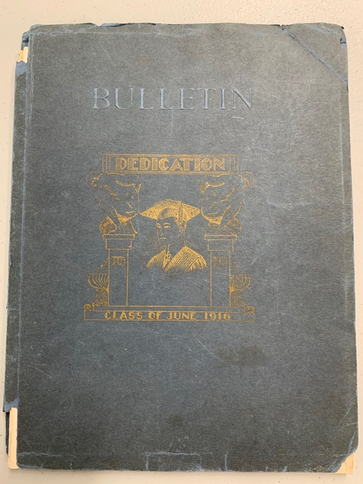 This is the cover of the Davenport High "Blackhawk" yearbook from 1916. The front cover is deep blue material, with a gold-leaf style emblem. Large letters above the emblem read, "BULLETIN," while the emblem itself depicts a graduating students standing in an arch with a caption that reads, "Class of June, 1916." This content can be used with the following resources: SS-Gov.9-12.27: Unique Iowa Systems SS-Gov.9-12.28: Iowa Issues and Policy This content can be used to educate students about the Iowa education system of the early 20th century and how the issues that surrounded public education at that time influenced wider discussions regarding public policy and government. For any use other than instructional resources, please check with the organization that owns this item for any copyright restrictions. |