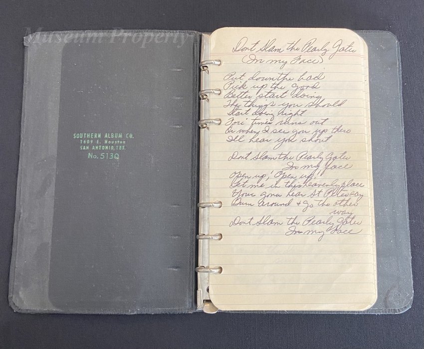 Songbook contains handwritten lyrics written by J.P. Richardson, the Big Bopper. "Don't Slam the Pearly Gates (In My Face). Put down the bad Pick up the good Better start doing the things you should Start doing right For time runds out Or when I see you up there I'll hear you shout Don't Slam the Pearly Gates In my face Open up! Open up! Let me in this heavenly place You're gonna hear St. Peter say Turn around and go the other way Don't Slam the Pearly Gates In my face 2021.002.003a is a page that contains lyrics written by J.P. Richardson, the Big Bopper, for By Ole Booze Bye Ole Booze For ever more My drinking days are surly ore I had a good time But I will agree that drinking Booze are killing me When I die you can bury me With a bottle of booze At my head and feet Put a pair of dice in my right hand Gona shoot my way lawd Shoot my way to the promise Land I started drinking for fun Man I loved that stuff Ain't gona drink another drop Cause the devils juice sure is rough O if I go on down below 2021.002.003b shows the songbook's front cover. |
