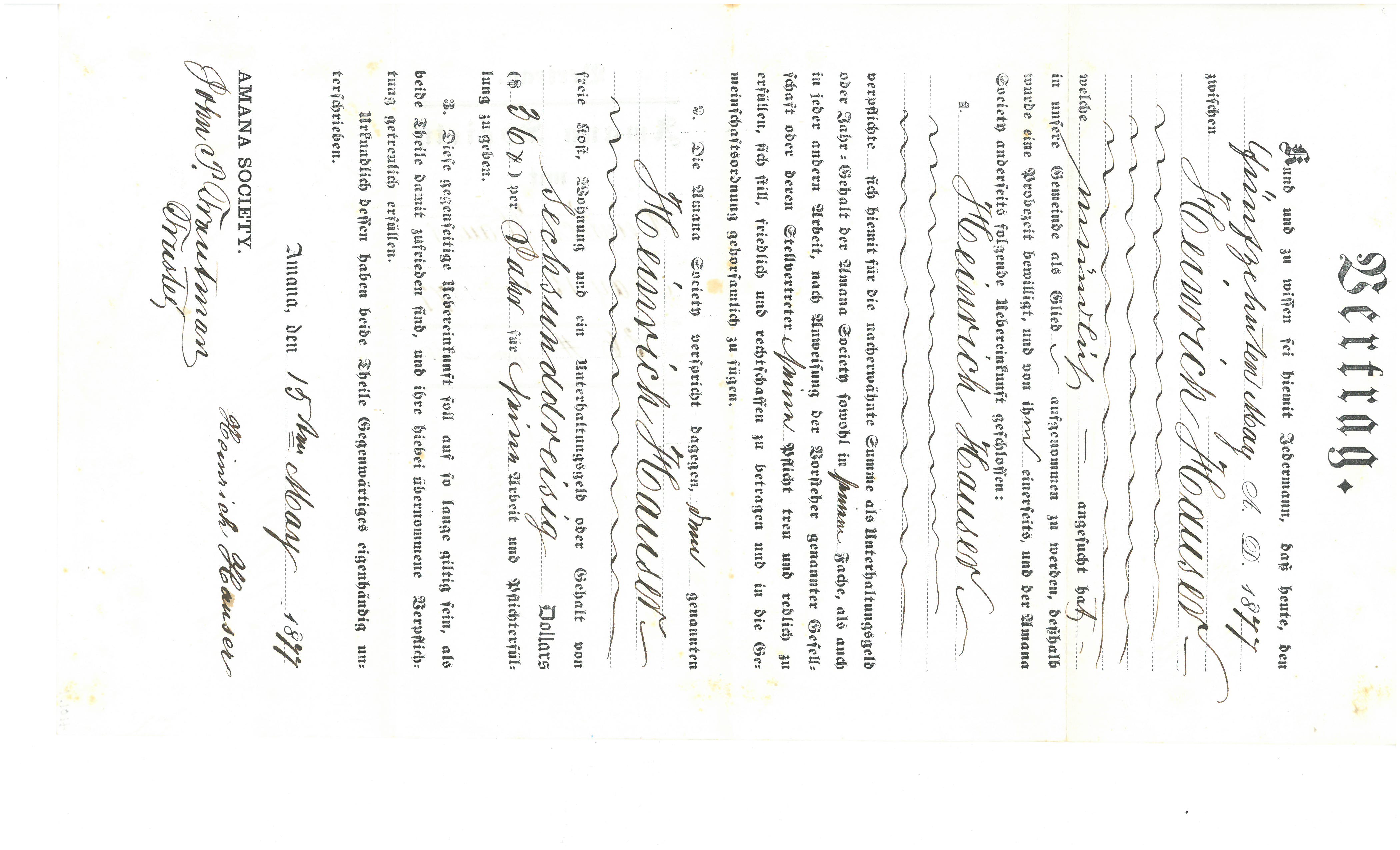 The Amana Society used contracts like this one during the late 1800s. The contract defined the duties of both the Society and the individual community member the contract was made for. This contract was written for an Amana Colonies settler named Heinrich Hauser. It reads: "May it be known today, May 15th, 1877, between Heinrich Hauser, who verbally inquired to be accepted as a member of our Community, therefore be on probation, and from him on the one hand, and the Amana Society on the other that they enter into the following agreement: 1. Heinrich Hauser Shall endeavor himself for the agreed sum of money as an allowance or wages of the Amana Society, in his trade as well as in his other duties, according to the instructions of the Elders of this society or their representatives to fulfill his duties faithfully and honestly, peacefully and righteously to conduct himself and to comply obediently to the Community’s religious order. 2. The Amana Society shall be obligated to Heinrich Hauser to provide, free of cost, living quarters and an allowance of $36 per year for his work and fulfillment of duties. 3. This dually agreed upon contract shall remain valid so long as both parties are satisfied, and the hereby accepted duties are fulfilled. Both parties have in person documented this by signing in their own hand. Amana, May 15th , 1877 Amana Society John P. Trautmann, Treasurer Heinrich Hauser" Content can be used with the following standards: 3rd grade SS 3.26 Immigration and Migration in a lesson on the impact of immigrants on the state and the organizations/establishments they have created. For any use other than instructional resources, please check with the organization that owns this item regarding copyright restrictions. |