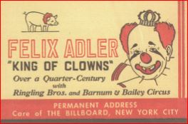 Frank "Felix" Adler used business cards like this one to advertise his work as the "King of Clowns." Frank Adler, who later used the stage name Felix Adler, was born in Clinton, Iowa on June 17, 1895. At the age of 15, Adler began working as a comedian around the Clinton area. Sometime around 1914, Adler joined Ringling Bros. and Barnum & Bailey circus. Shortly after, however, Adler left the circus and served in the Army during World War I. In 1919, Adler returned to the circus and became "Funny Felix the Clown." During his career, Adler appeared in movies and TV shows including The Greatest Show on Earth (1952), The Jackie Gleason Show, Person to Person, Howdy Doody Show, Super Circus and Martin Kane Private Eye. He was the first American clown on television. Adler also earned the nickname, "The Whitehouse Clown" for the many times he performed for United States presidents, including Warren Harding, Calvin Coolidge, and Franklin D. Roosevelt. In 1948. Adler married Amelia Irwin, who also was a circus clown. The duo became the first husband and wife circus clown team. The pair retired from the circus in 1959. Frank "Felix" Adler passed away on February 1, 1960 and was buried in Clinton, Iowa. To celebrate his life, the town of Clinton celebrates Felix Adler Day each June. Content can be used with the following standards: 3rd grade SS 3.28 Cultural Contributions in a lesson on entertainment in the mid-1900s. For any use other than instructional resources, please check with the organization that owns this item regarding copyright restrictions. |