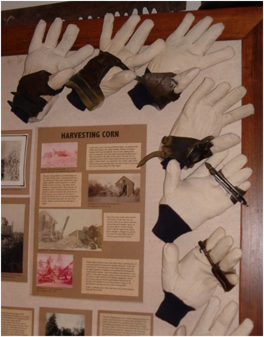 Before farmers used large machinery to harvest corn, the work was done by hand. As corn was harvested, husking hooks that were attached to the gloves either near the palm or on the fingers, were used to rip corn husks open so that the ears of corn could be easily air-dried in corn cribs. Content can be used with the following standards: 4th grade SS 4.25 Changes to Agriculture in a lesson on new inventions and practices that helped agriculture in Iowa. For any use other than instructional resources, please check with the organization that owns this item regarding copyright restrictions. |