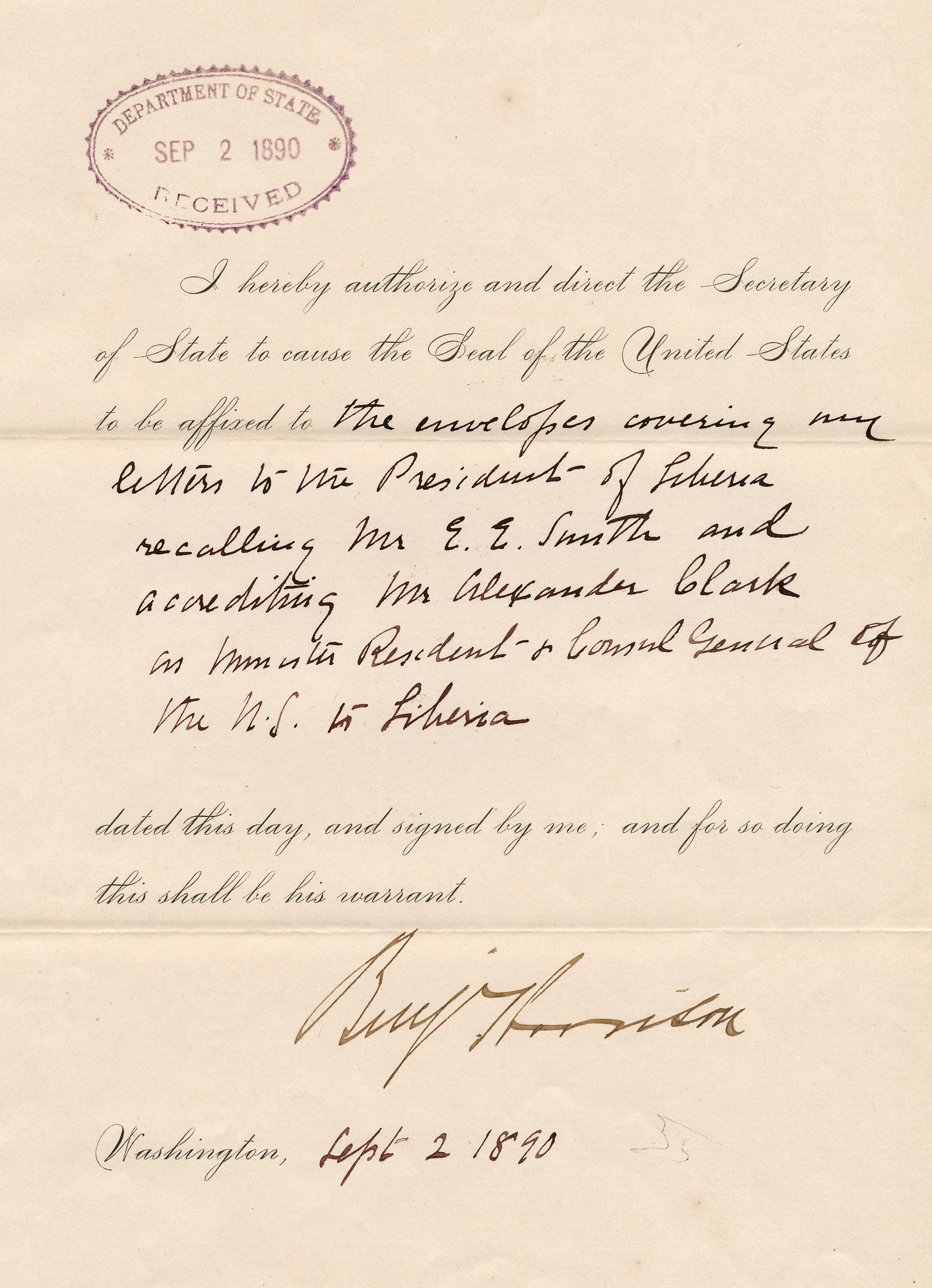This document, signed by President Benjamin Harrison, appointed Alexander Clark as the ambassador to Liberia. Alexander Clark was born free in Pennsylvania in 1826 and moved to Muscatine, Iowa, at the age of 16 to work as a barber. Once settled, he opened a business selling firewood to Mississippi River steamboats and thereby amassed considerable wealth. He also became an entrepreneur in local real estate. During the second half of the 19th Century, Clark was active in Republican politics and was called "the Colored Orator of the West" for his speeches on the right of suffrage. In 1868, Clark was appointed chairman of a "colored mans" committee to rewrite the Iowa State constitution, eliminating the word "white" from the document, and thereby granting political equality to Iowans two years before the ratification of the Fifteenth Amendment to the United States Constitution. Clark is notable in Iowa history for other things, too. He sued the Muscatine school board on behalf of his daughter, Susan, in a landmark case that outlawed school segregation in Iowa. His son, Alexander Jr., became the first black graduate of the University of Iowa law school in 1879. Alexander Sr. became the second black graduate of the law school in 1884 at the age of 58. In 1890, President Benjamin Harrison offered Clark the opportunity to become the first United States ambassador to the nation of Liberia at an annual salary of $4,000. Clark died of fever in Liberia in 1891. Content can be used with the following standards: 3rd grade SS 3.28 Cultural Contributions, 5th grade SS 5.26 Civil Rights, 8th grade SS 8.25 Iowa Governments, SS-Gov.9-12.28 Iowa Issues and Policy and SS-U.S. 9-12.23 Iowans Influence U.S. History. Lessons can be formed on Clarks' contribution to fighting for civil rights change in Iowa and the legislation changes regarding African-Americans during the late 1800s after the Civil War. Photographs of the original document are attached. A transcript of the document is also attached. For any use other than instructional resources, please check with the organization that owns this item regarding copyright restrictions. |