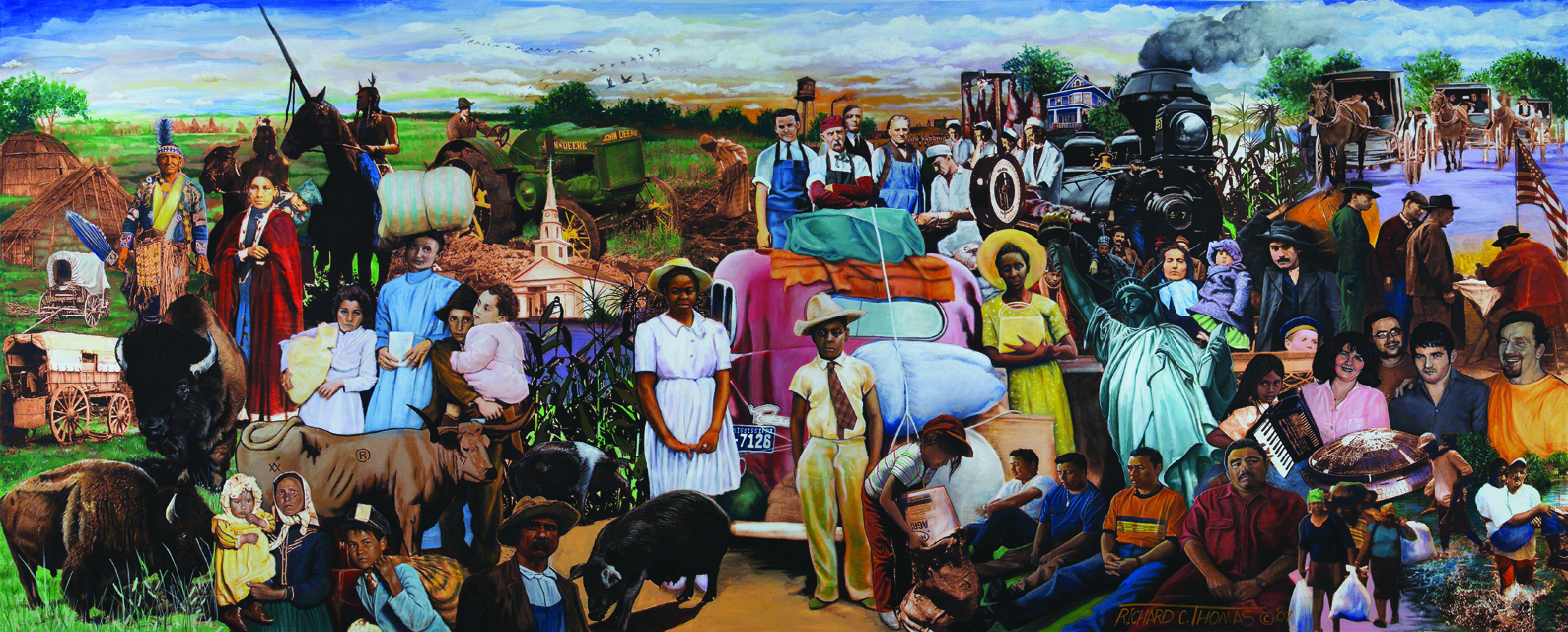 We the People (KEKI ME METOSE NENIWA) by Richard C. Thomas vinyl mural printed from mixed media on canvas, 2007 Purchased by the Waterloo Center for the Arts, 2007.0587 Richard C. Thomas planned this masterful composition, viewable on the parking garage above Waterloo’s Lafayette street, after researching the history and culture of Waterloo, IA. The mural celebrates the long history of habitation in the Cedar Valley. It acknowledges early presence of Native Americans, and the subsequent waves of immigrants who through their presence and work, have made, and continue to make, important contributions to the character of the area. For any use other than instructional resources, please check with the organization that owns this item regarding copyright restrictions. |