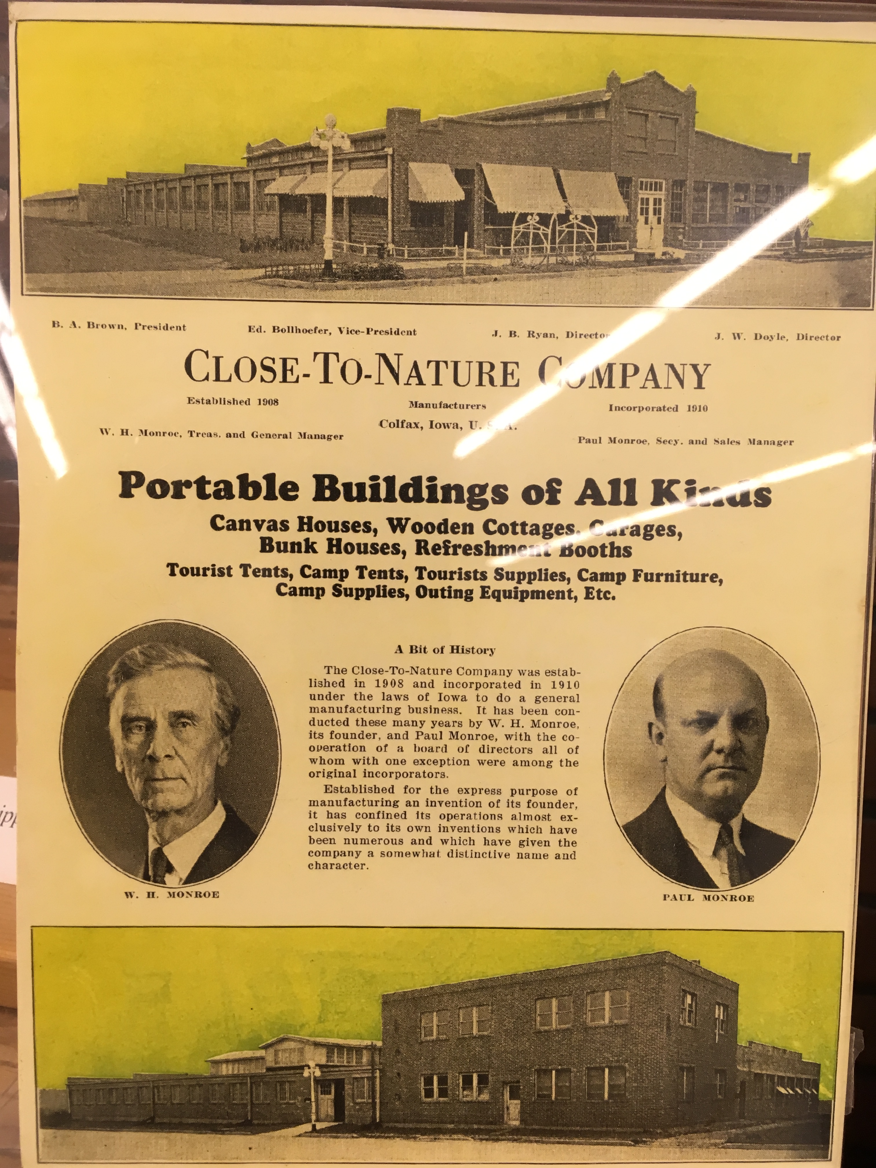 The Close-To-Nature Company was created in 1908 but was not incorporated under Iowa laws until 1910. The company was set up to do general manufacturing. The company was established and ran by W.H. Monroe and Paul Monroe. Even though this company was established on the grounds of "general manufacturing," the company mostly made W.H. Monroe's inventions. The company made "portable buildings of all kinds": canvas houses, wooden cottages, bunk houses, refreshment booths, tourist tents, camp tents, tourist supplies, and numerous other necessities needed for camping or outdoor events. For any use other than instructional resources, please check with the organization that owns this item regarding copyright restrictions. |