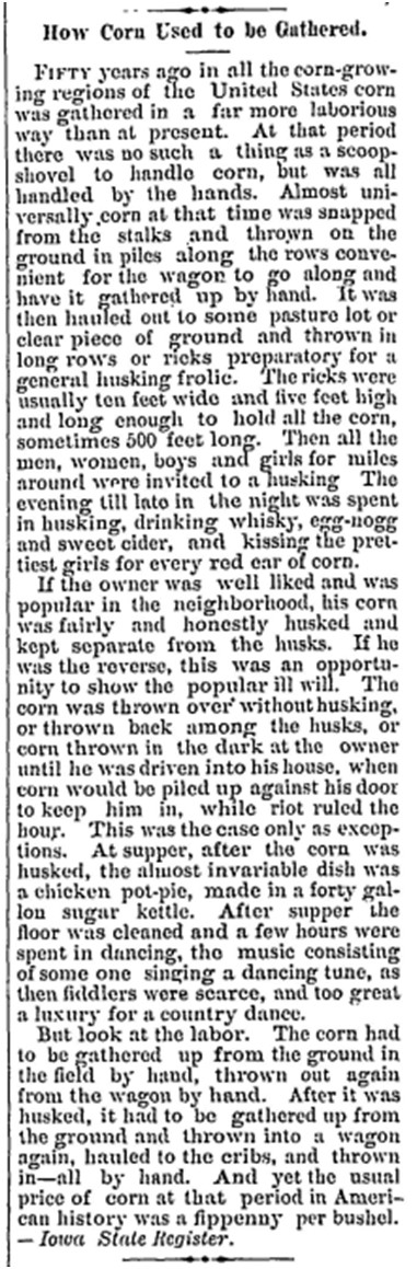 As described in the article, previous harvesting methods did not involve machinery but instead was all done by hand and transported with wagons. The harvested corn would be taken to an open pasture where surrounding families would gather to husk the corn together. This often turned into a social event with drinking and talking. If the owner of the pasture was well-liked, he would be left with a good deal of corn, however if he was not liked, corn would be thrown at him until he took shelter in his house, where then corn would be placed against his door to lock him in. After husking the corn, a dinner would be served and music played throughout the night. |