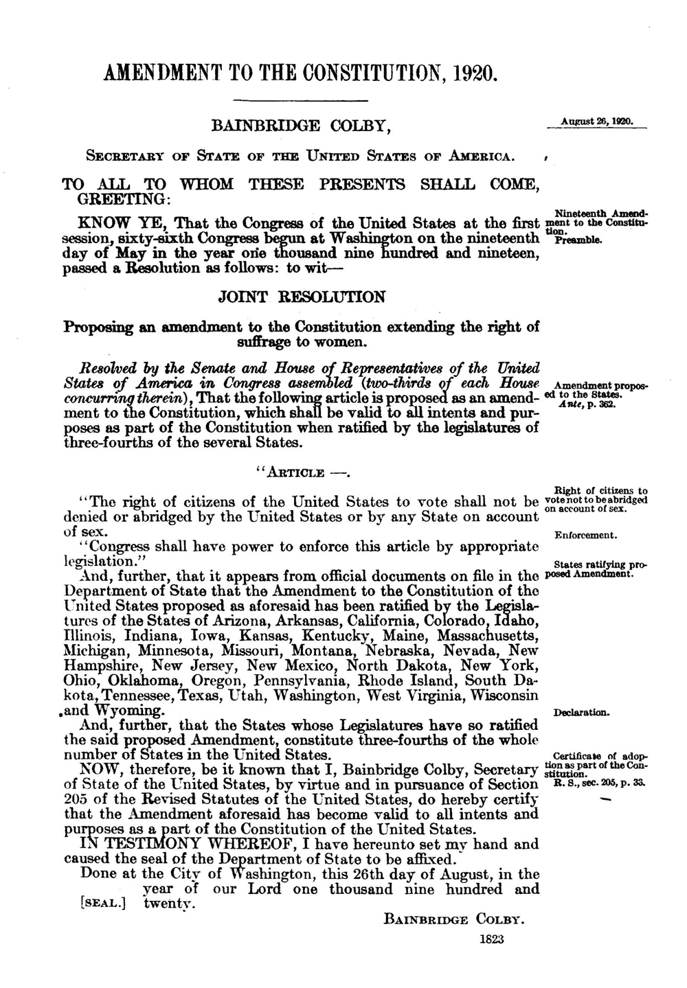 The 19th Amendment, which passed in 1920, came after a long struggle of women to gain their equal rights that began in the mid-1800s. In 1848, the first women's right convention was held at Seneca Falls, New York where 68 women and 32 men signed the Declaration of Sentiments. The Declaration called for laws to reflect the equality between men and women and that women too deserve unalienable rights that are guaranteed to men. This declaration began the women's movement to equality, with the first National Women's Rights Convention taking place in Massachusetts two years later in 1850. Women such as Susan B. Anthony and Elizabeth Cady Stanton formed the National Women's Suffrage Association to further promote the push for equality, with primary focus on gaining the right to vote. In 1893, Colorado became the first state to grant women the right to vote, followed by Utah and Idaho in 1896 and the state of Washington in 1910. By 1918, California, Oregon, Kansas, Arizona, Alaska, Illnois, Nevada, Montana, New York, Michigan, South Dakota and Oklahoma all granted women the right to vote. In 1919, the amendment drafted by Susan B. Anthony in 1878 is passed by the House of Representatives and the Senate. A year later on August 26 1920, the amendment is passed as a law by Secretary of State Bainbridge Colby. |