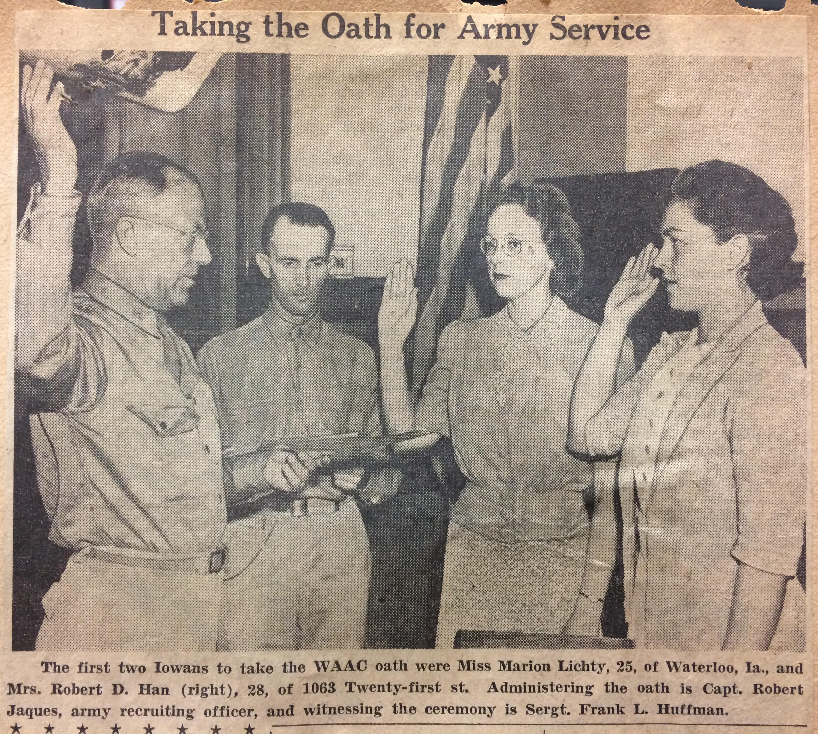 This object is a newspaper clipping which depicts two women being sworn into the Women's Army Auxiliary Corps (WAAC) at Fort Des Moines. The two women were Miss Marion Lichty (left) and Mrs. Robert D. Han (right). These women were originally from Iowa, and they were the first two Iowans to take the WAAC oath. Captain Robert Jaques administered the oath. The last person in the photograph is Sergeant Frank L. Huffman who is observing the ceremony. For any use other than instructional resources, please check with the organization that owns this item regarding copyright restrictions. |