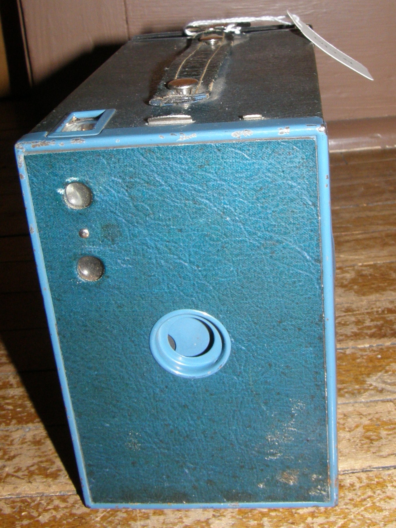 Eastman Kodak box camera, Brownie No.2A Model C. The model C was produced in the US between 1924 and 1933 and used size 116 film. This one has a blue metal housing with a black leather strap handle. For any use other than instructional resources, please check with the organization that owns this item regarding copyright restrictions. |