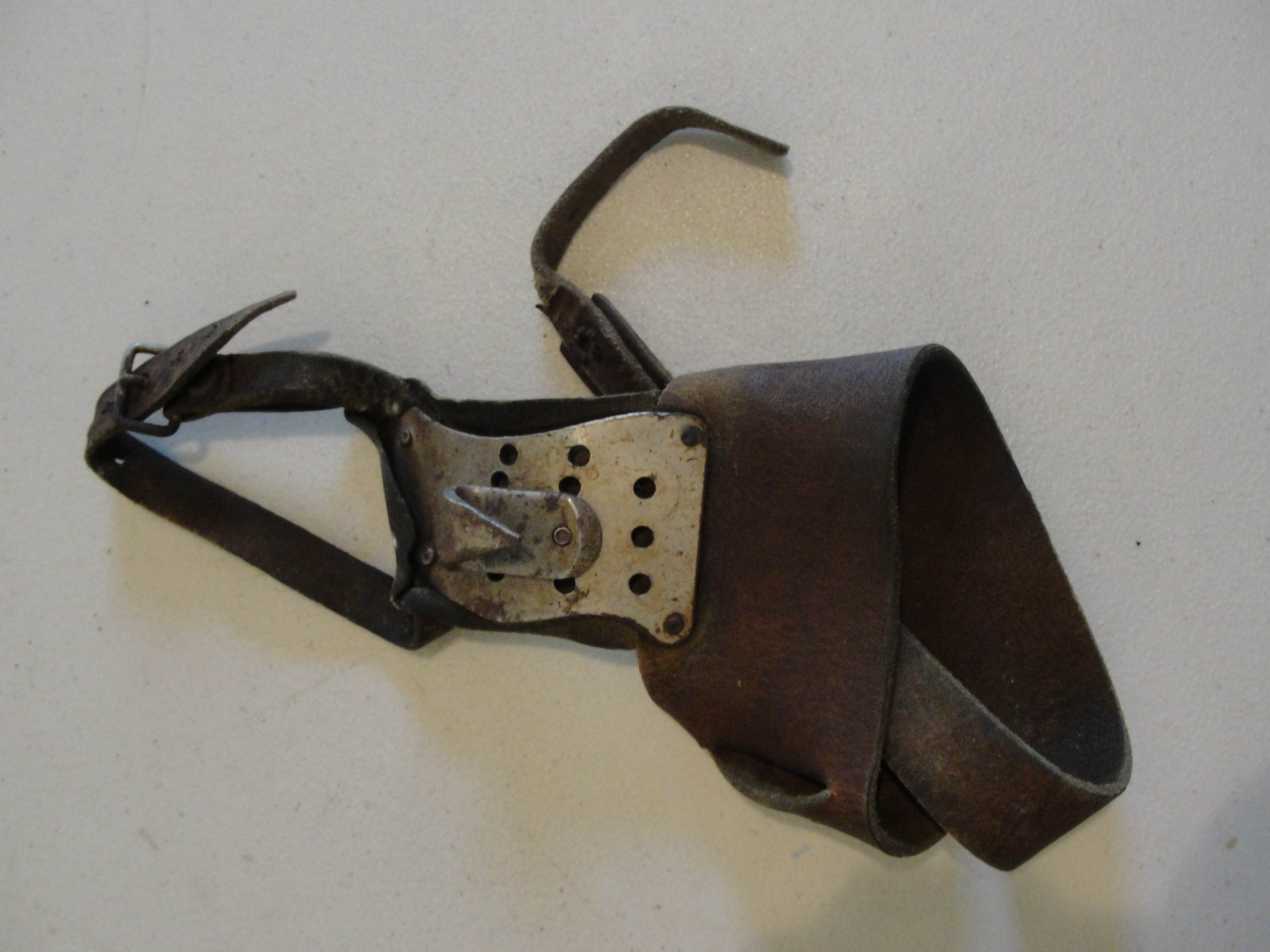 This hand corn husking glove is made of leather with a metal hook attached. There are two leather bands with buckles. The thicker of the two bands secures around the wrist and the thinner band wraps around the top of the hand. For any use other than instructional resources, please check with the organization that owns this item regarding copyright restrictions. |