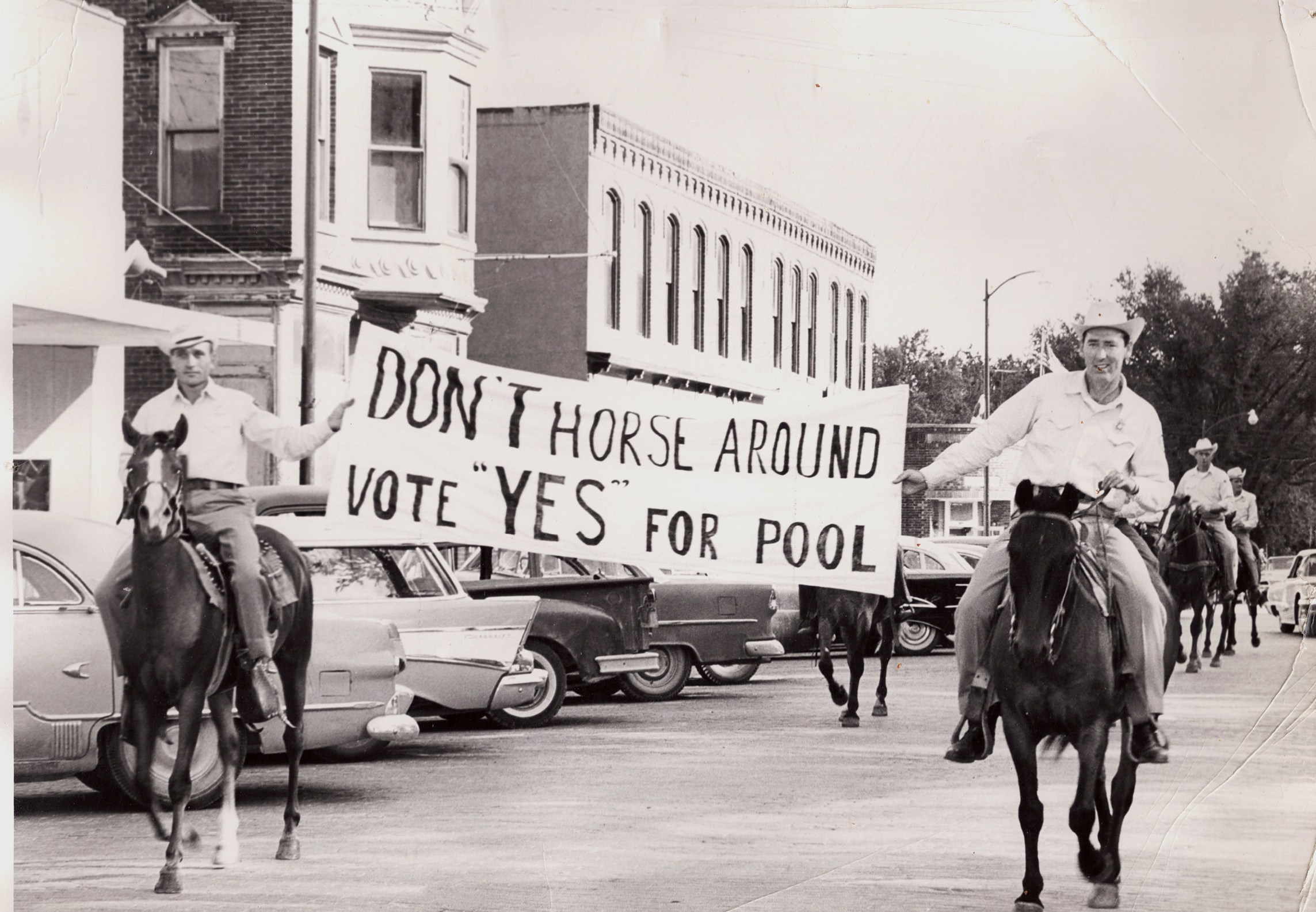 On August 31, 1962, the town of Mount Ayr, Iowa held a vote to decide if it should build a swimming pool or not. This photograph shows Ringgold County resident Marvin Reynolds and Ringgold County Sheriff Elbert Strange as they displayed a banner that encouraged people to vote yes for the pool. The town voted in favor of the pool, which was built the following year. Content can be used with the following standards: 3rd grade SS 3.28 Cultural Contributions in a lesson on town expansion in the mid-1900s. For any use other than instructional resources, please check with the organization that owns this item regarding copyright restrictions. |