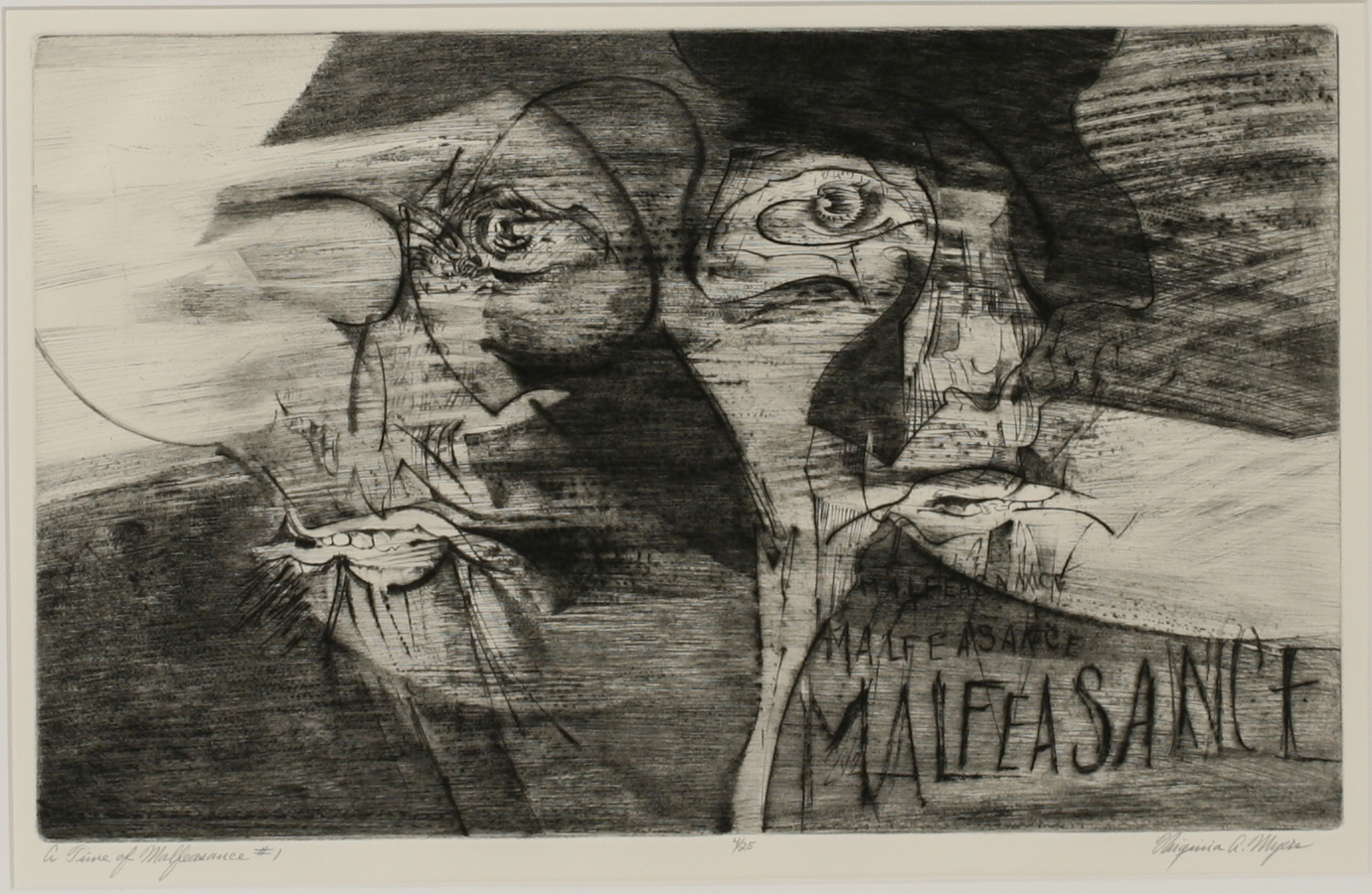Artist Virginia A. Myers (1927-2015) was born in Indiana and grew up in Ohio. She earned her M.F.A. in painting from the California College of Arts and Crafts, Oakland, and completed post-graduate work at the University of Illinois. In 1955 she went to the University of Iowa to study printmaking with Mauricio Lasansky. In 1962 she became a University of Iowa faculty member and taught printmaking in the School of Art and Art History. (Wikipedia). |
